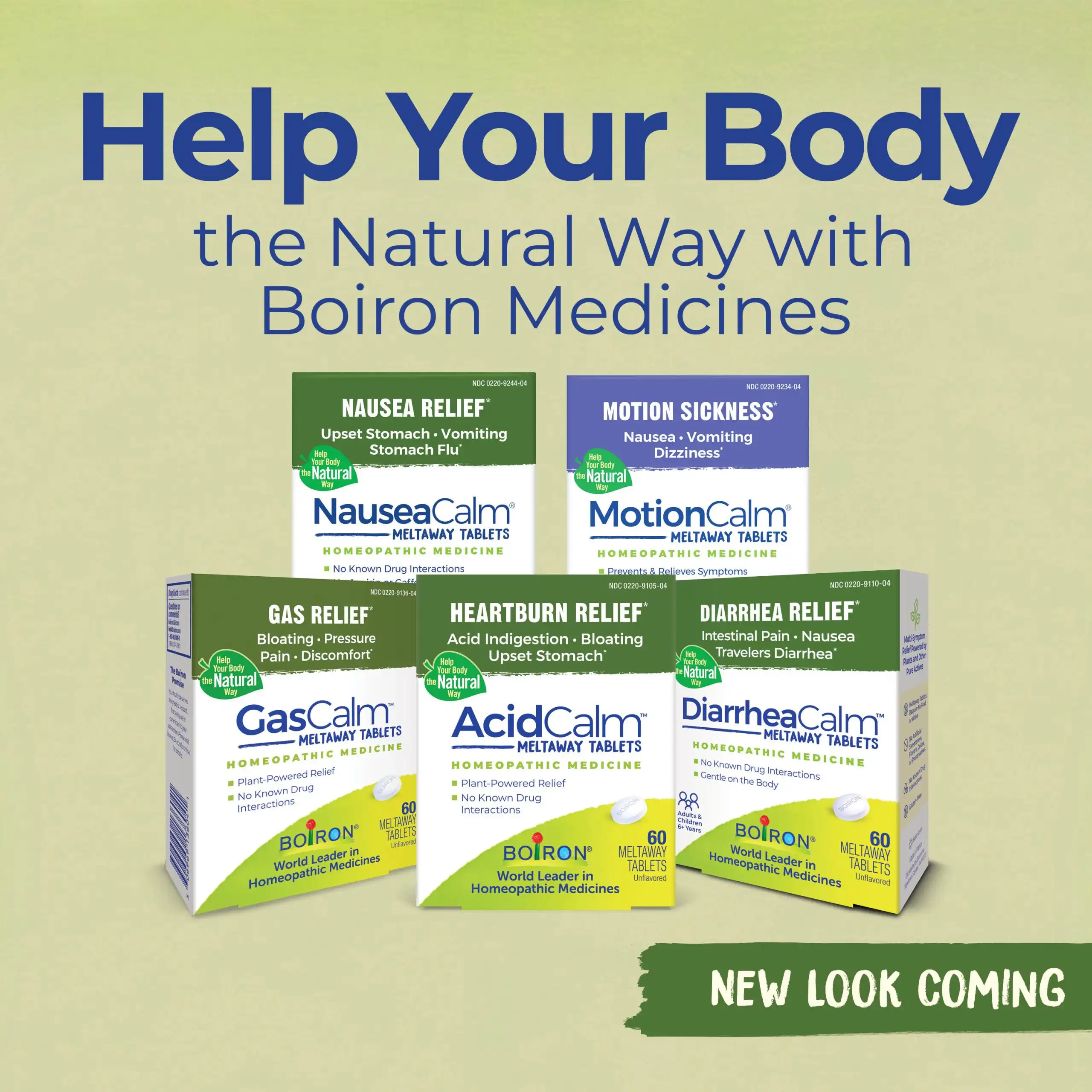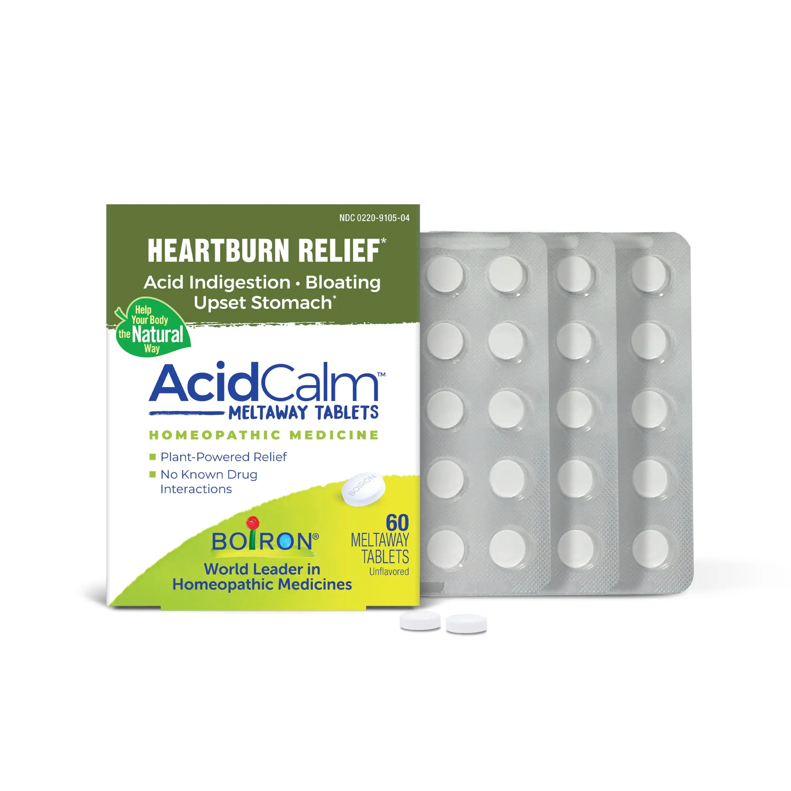 Stop the churning and burning with AcidCalm Meltaway Tablets by Boiron. They melt in your mouth to relieve occasional heartburn, acid indigestion, bloating, and upset stomach.* This homeopathic heartburn medicine is made with plant-based active ingredients and can be taken on a full or empty stomach.