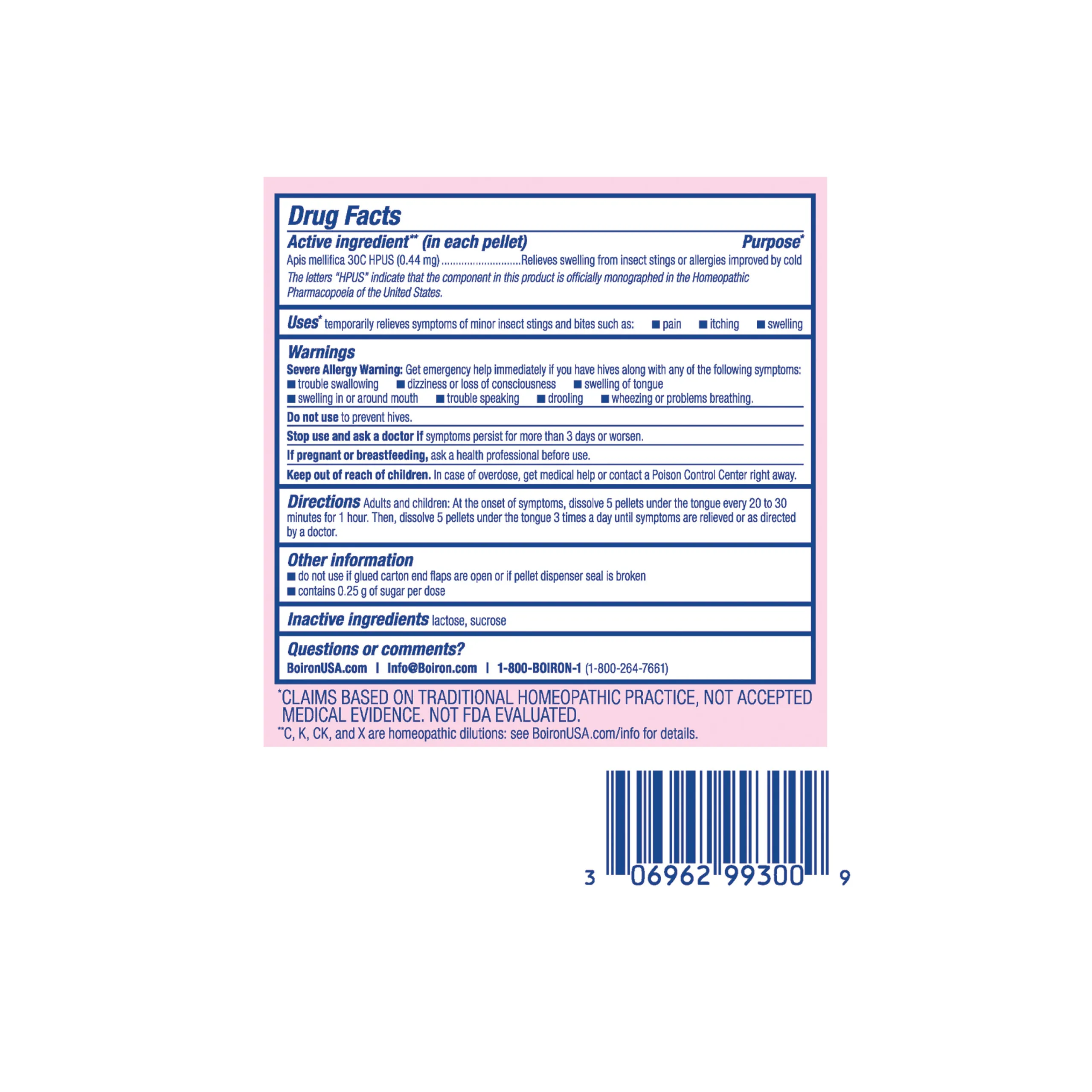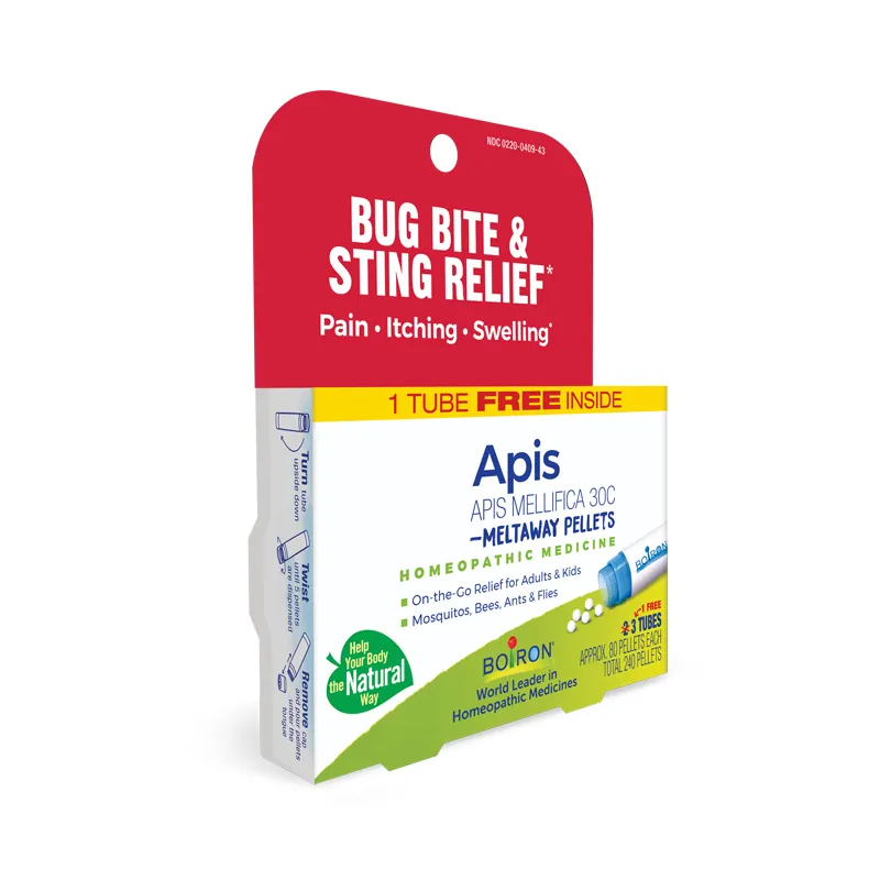 Customize your care with Boiron single medicines for highly targeted relief. Apis mellifica is a homeopathic medicine that is taken orally to relieve the pain, itching, and swelling of minor bug bites.* Ideal for adults and children, itโs designed for stings from mosquitos, bees, ants, flies, and other common insects. The meltaway pellets dissolve in the mouth without water and come in easy dispensing tubes to take on the go.