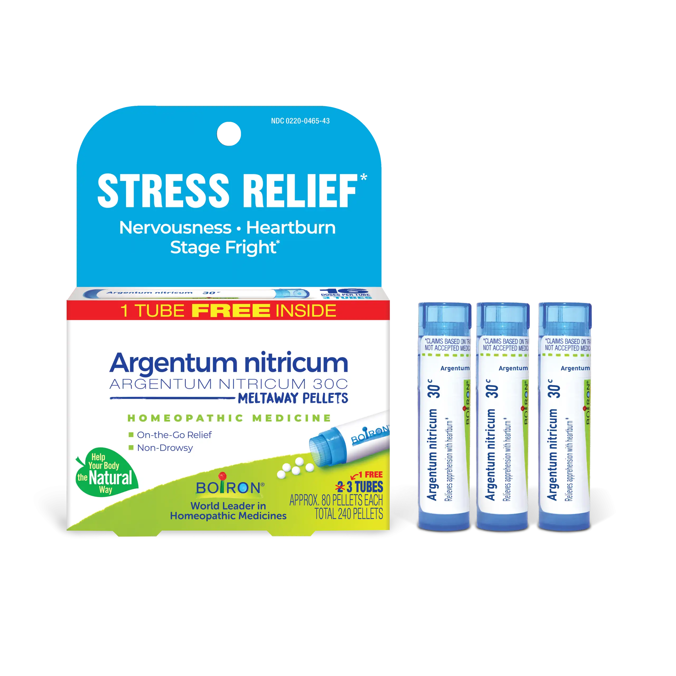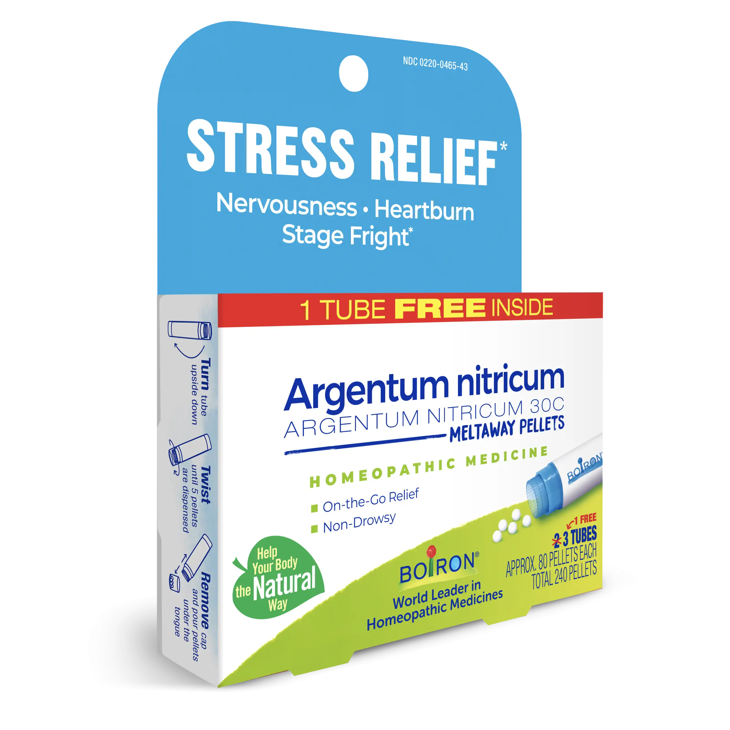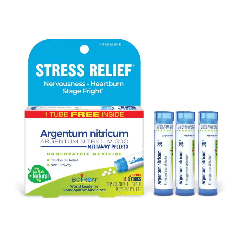 Customize your care with Boiron single medicines for highly targeted relief. Argentum nitricum 30C is a homeopathic medicine that targets symptoms of occasional stress such as nervousness, apprehension, stage fright, and heartburn caused by stress.* The non-drowsy meltaway pellets dissolve under the tongue without water and come in easy dispensing tubes to take on the go.