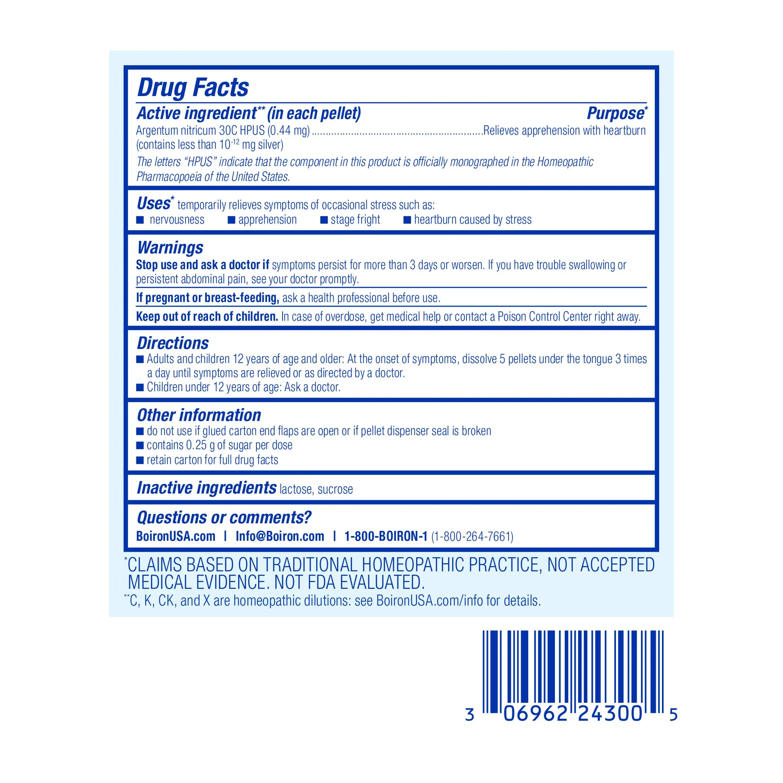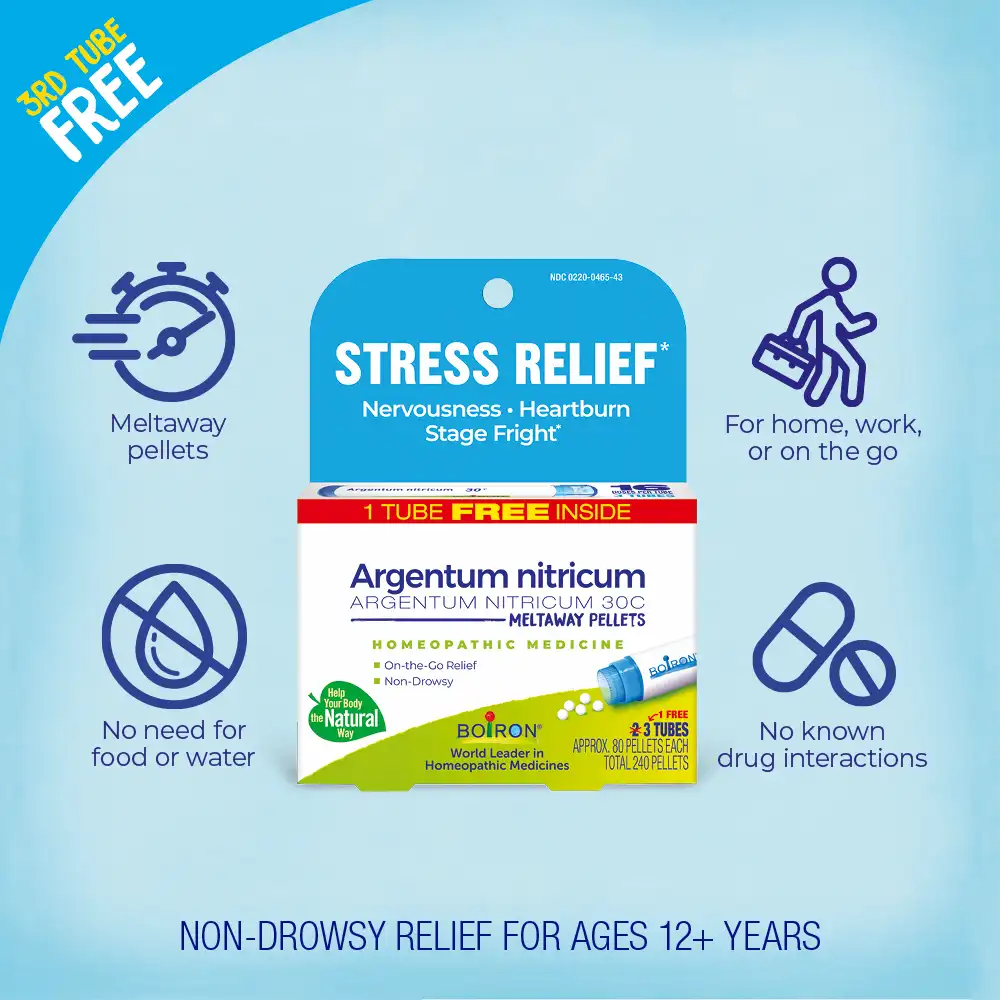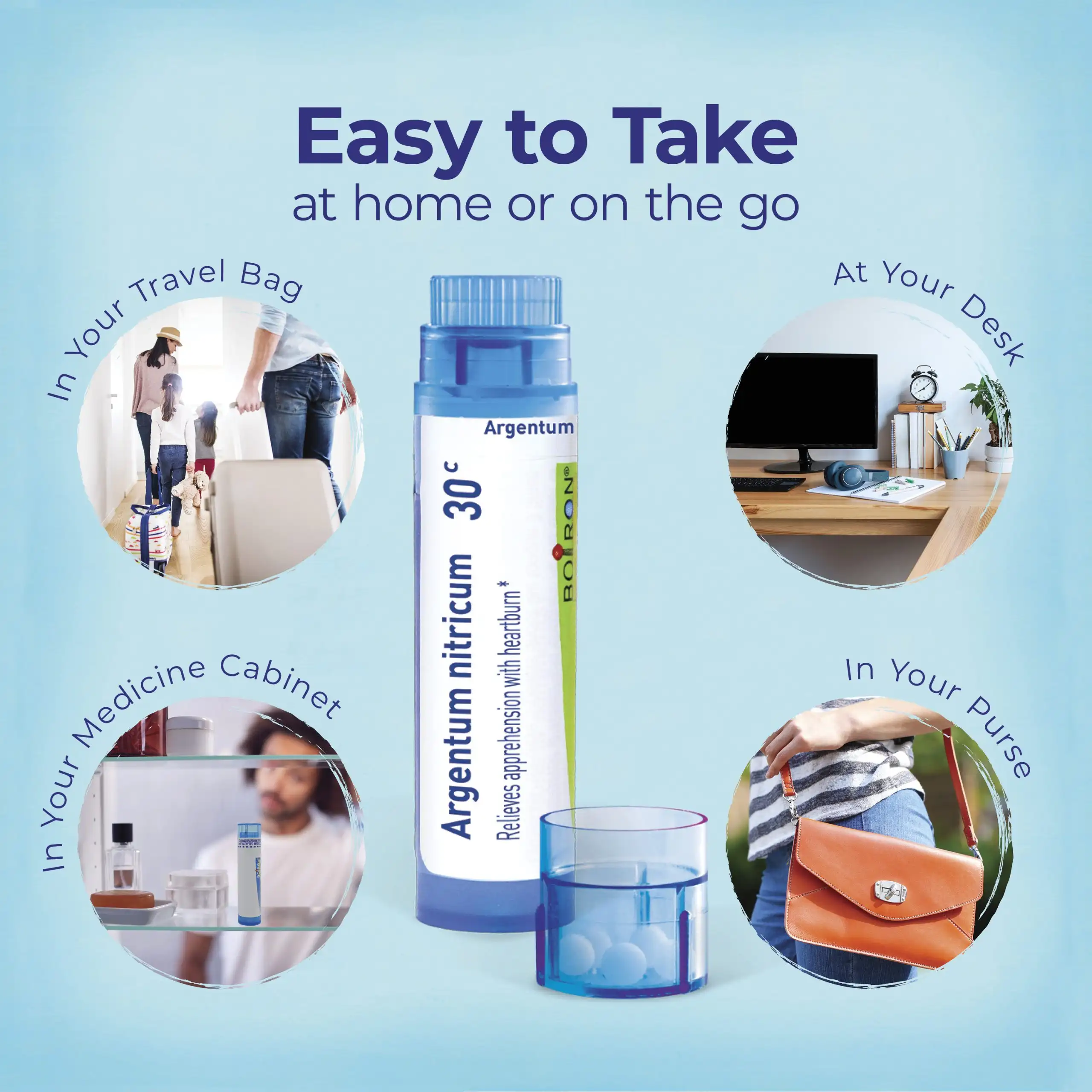 Customize your care with Boiron single medicines for highly targeted relief. Argentum nitricum 30C is a homeopathic medicine that targets symptoms of occasional stress such as nervousness, apprehension, stage fright, and heartburn caused by stress.* The non-drowsy meltaway pellets dissolve under the tongue without water and come in easy dispensing tubes to take on the go.