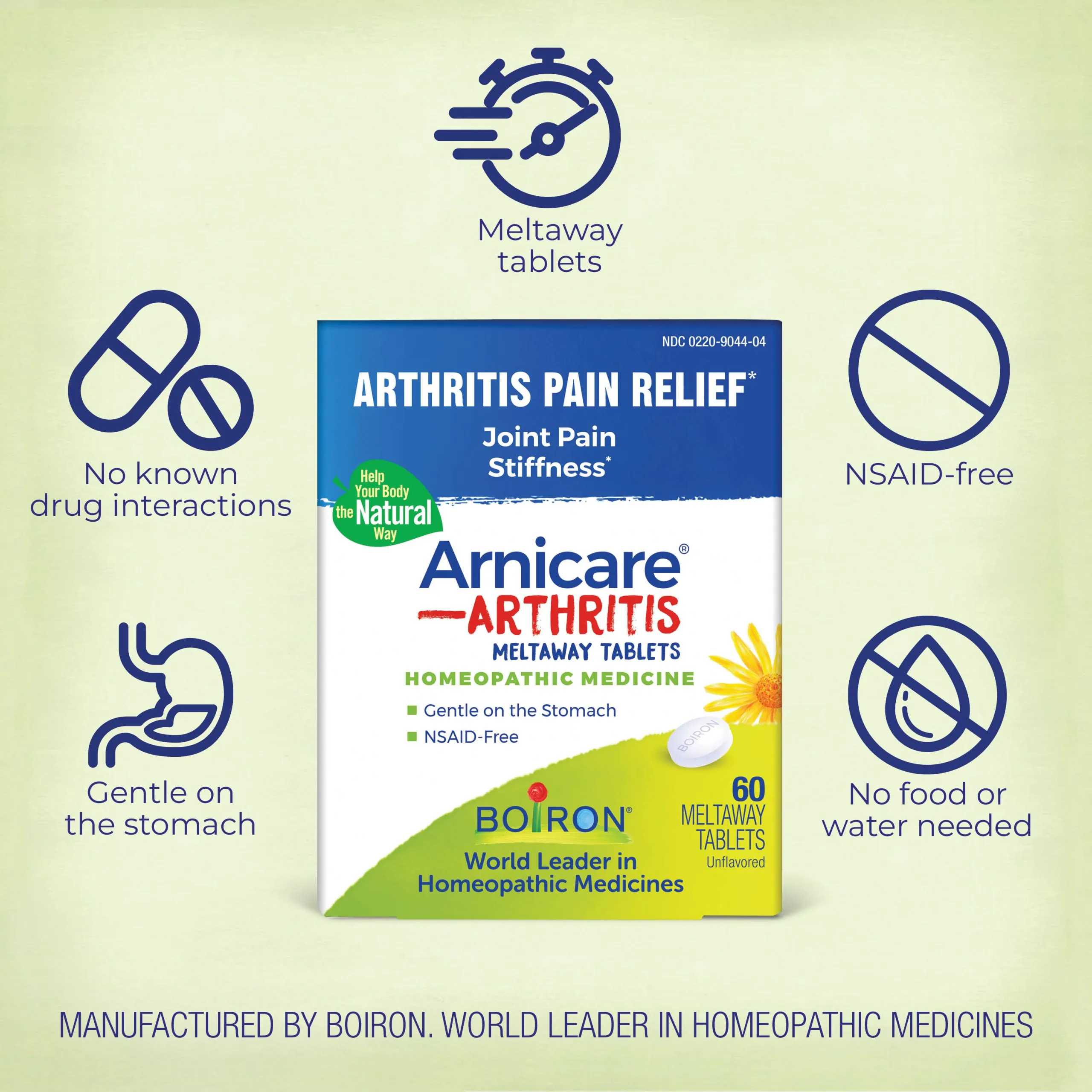 Arnicare Arthritis Tablets by Boiron relieve joint pain and stiffness, offering those concerned about drug interactions and pre-existing conditions a choice in relieving minor aches and pains associated with arthritis.*