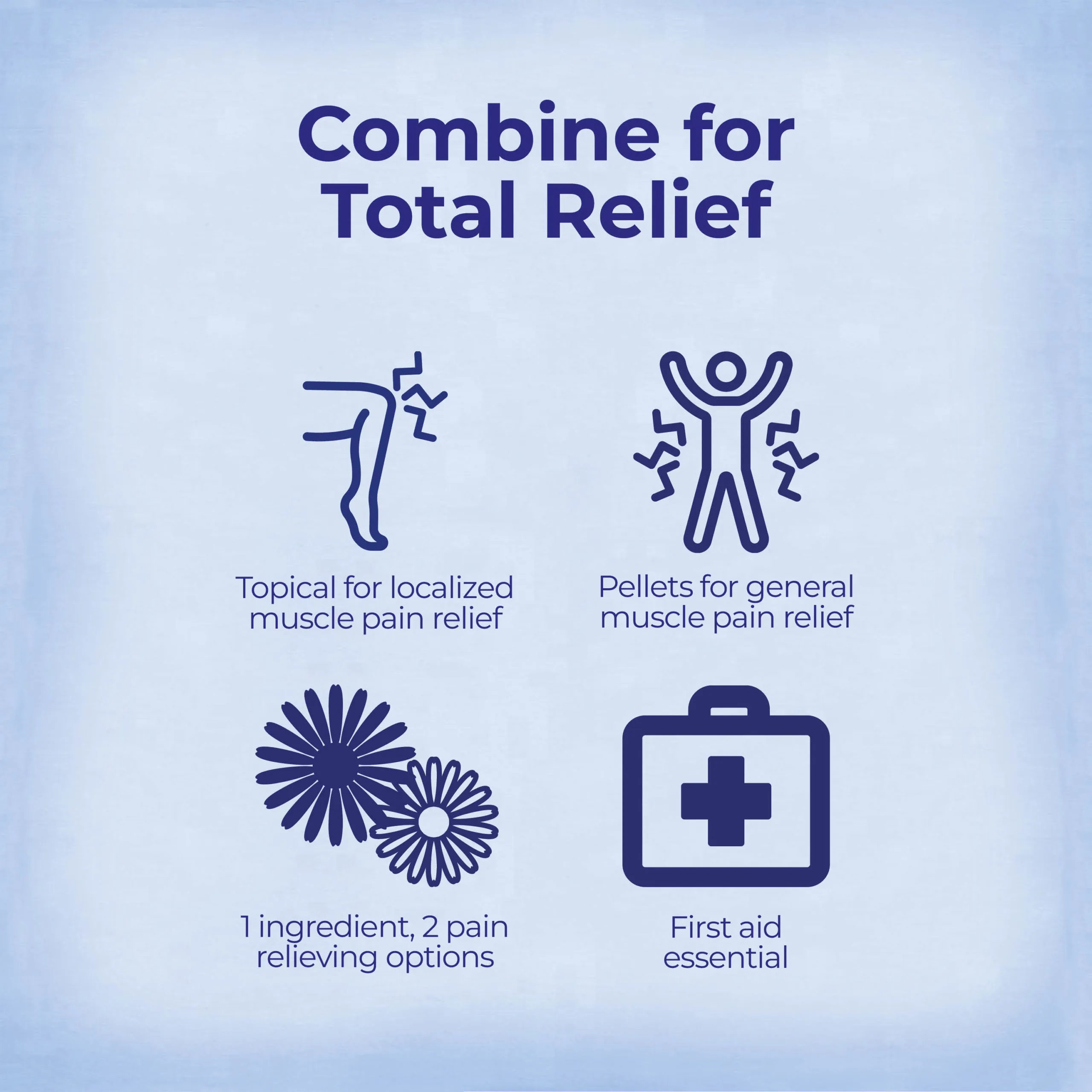 Arnicare Gel and Arnica montana 30C oral pellets relieve muscle pain, stiffness, swelling from injuries, and bruises.* Boiron’s Value Pack provides an economical and convenient way to combine general internal action with external spot treatment.