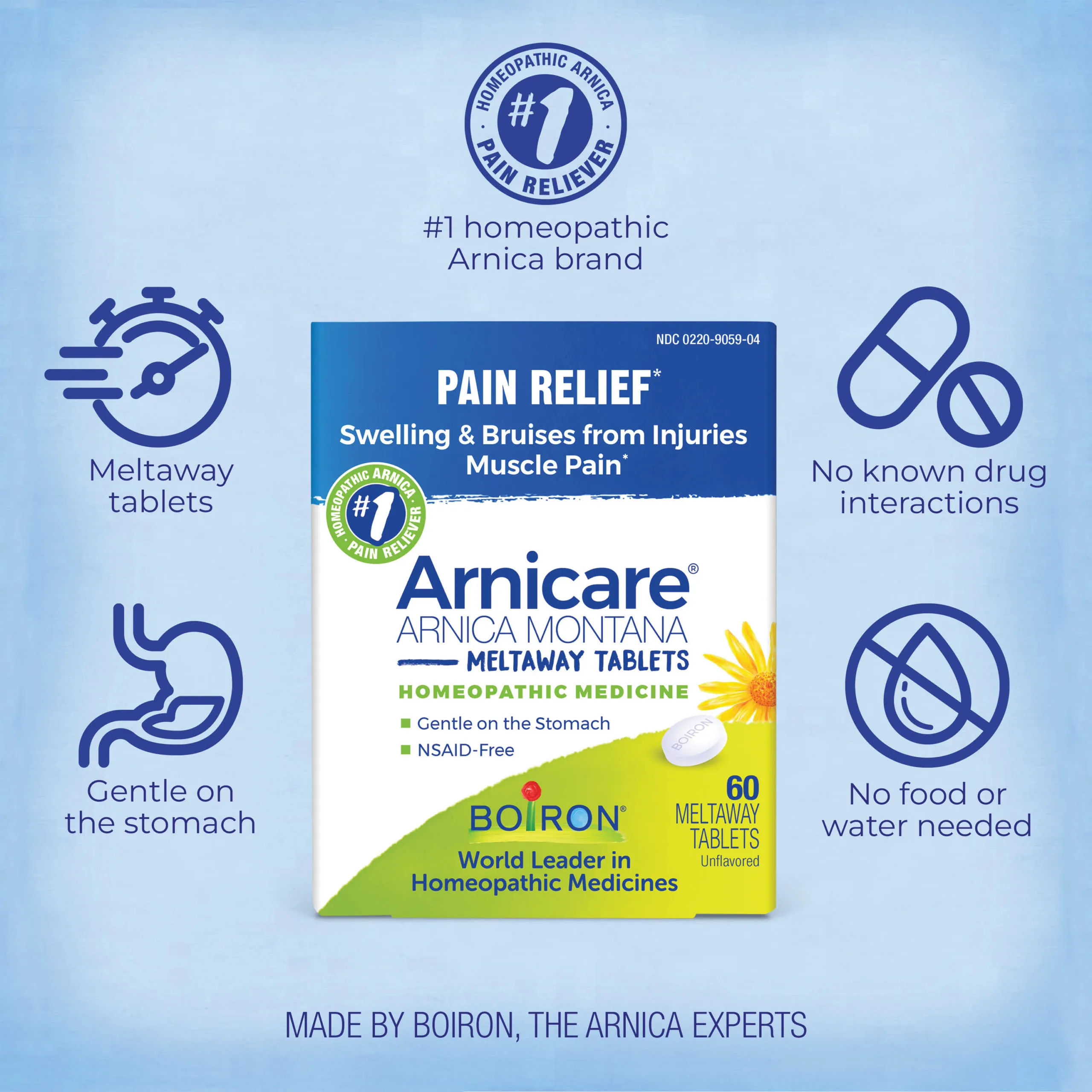 Arnicare Tablets by Boiron are powered by Arnica to relieve minor muscle pain, stiffness, swelling from injuries, and bruises.* A homeopathic medicine, Arnicare Tablets are non-drowsy and have no know interactions with other medications, herbs, or supplements. The meltaway tablets are easy to take without water and gentle on the stomach, making them convenient to take anywhere.