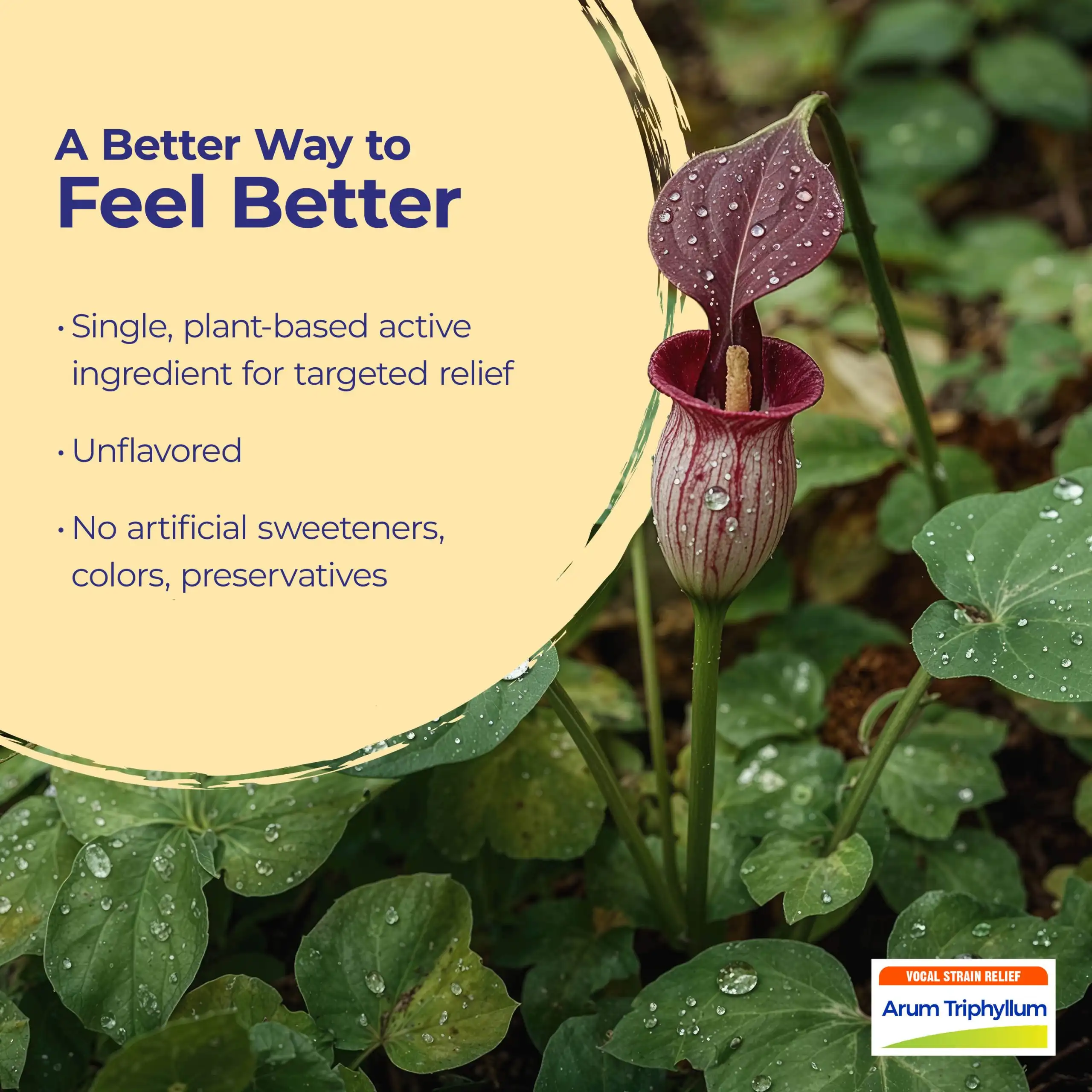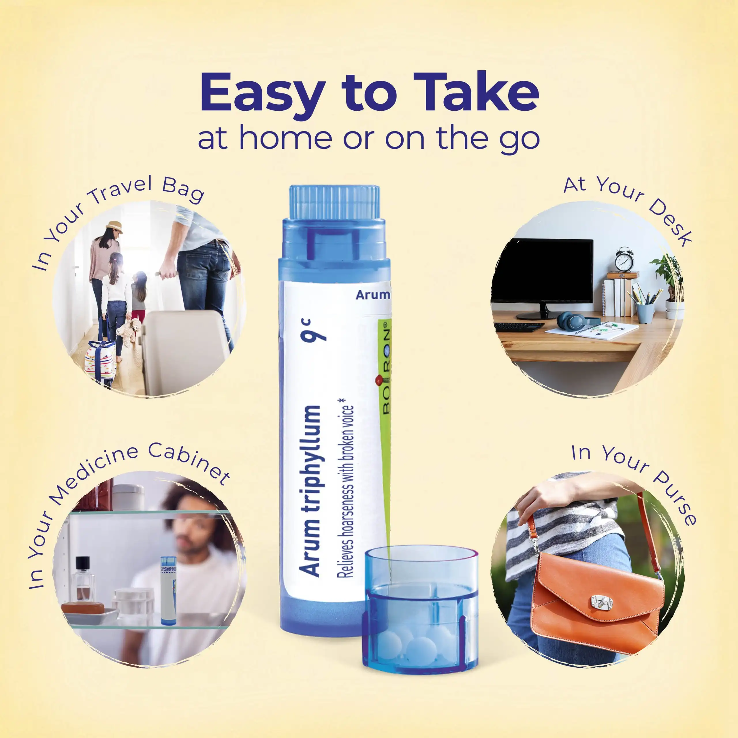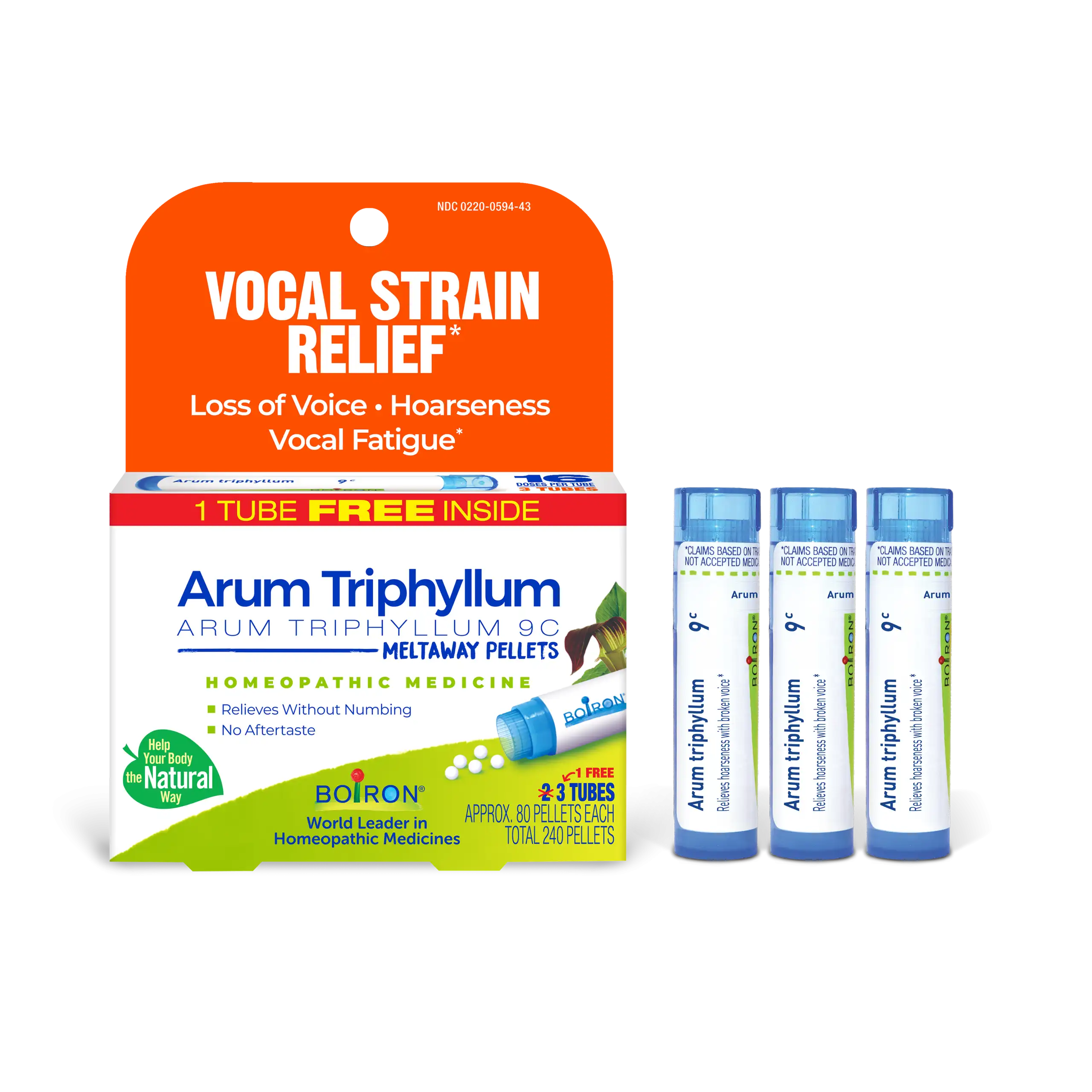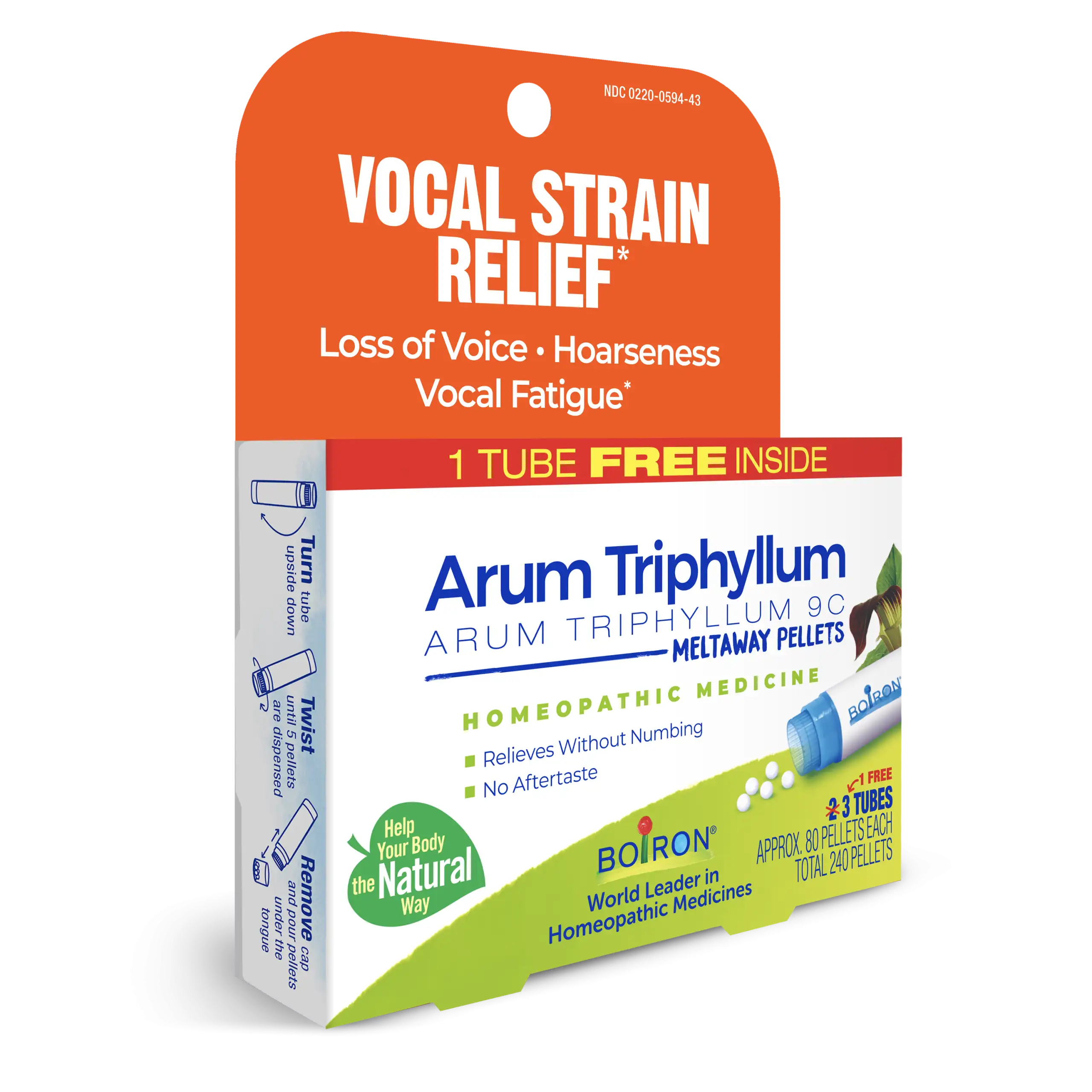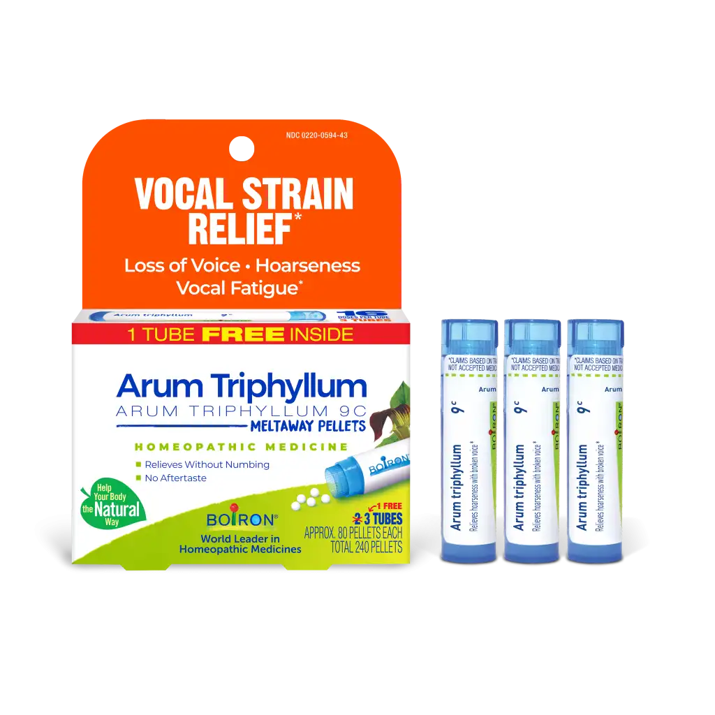 Customize your care with Boiron single medicines for highly targeted relief. Made with a plant-based active ingredient, Arum triphyllum 9C is a homeopathic medicine that works without numbing to target symptoms of vocal strain such as loss of voice, broken voice, hoarseness, and vocal fatigue associated with colds or overuse of the voice.* The meltaway pellets dissolve under the tongue without water and come in easy dispensing tubes to take on the go.