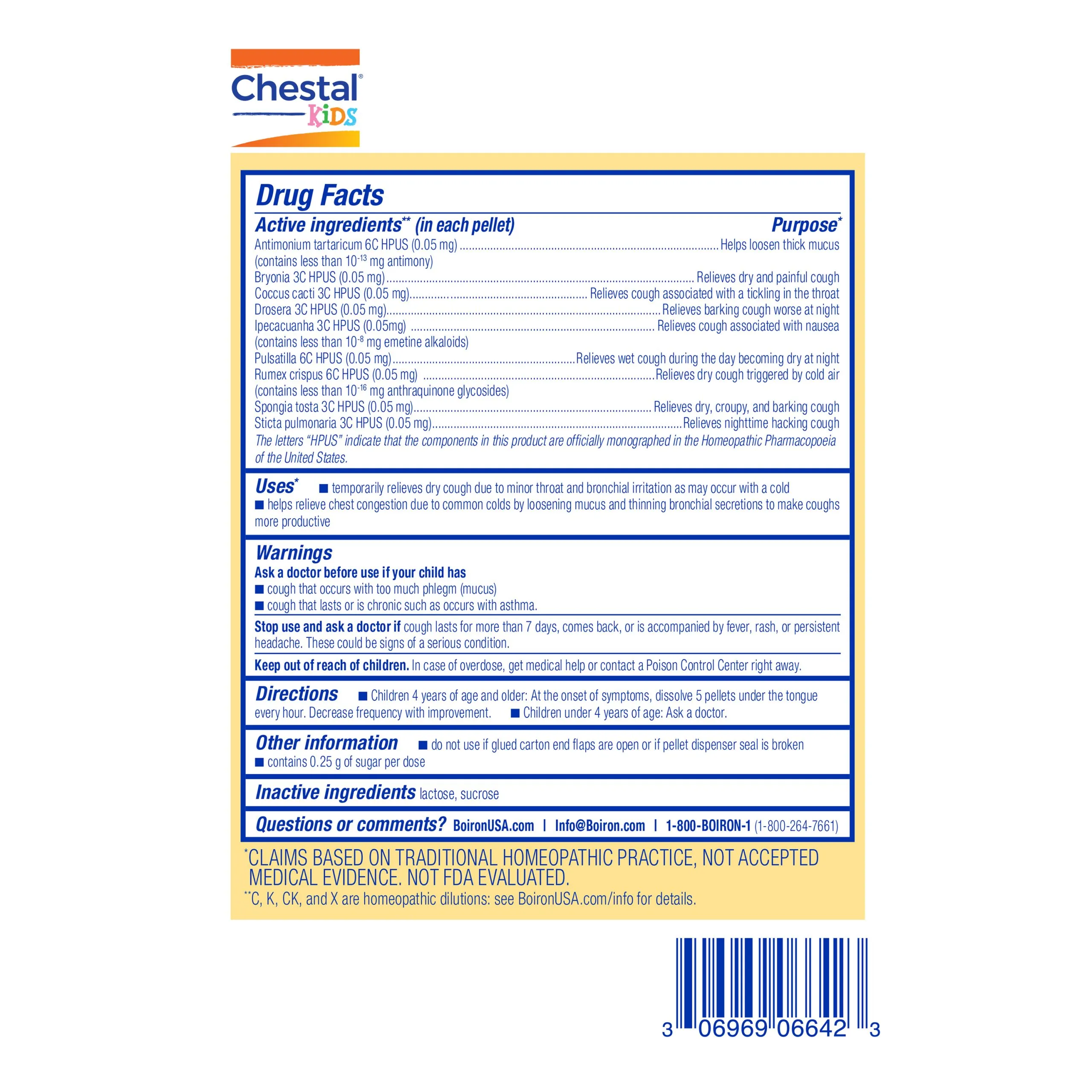- Chestal Kids Cough & Mucus Pellets (two tubes). Targets both wet and dry coughs while helping to loosen chest congestion.* The meltaway pellets are easy to take with a kid-friendly taste thatโs free of artificial sweeteners and dyes. For ages 4 and up.