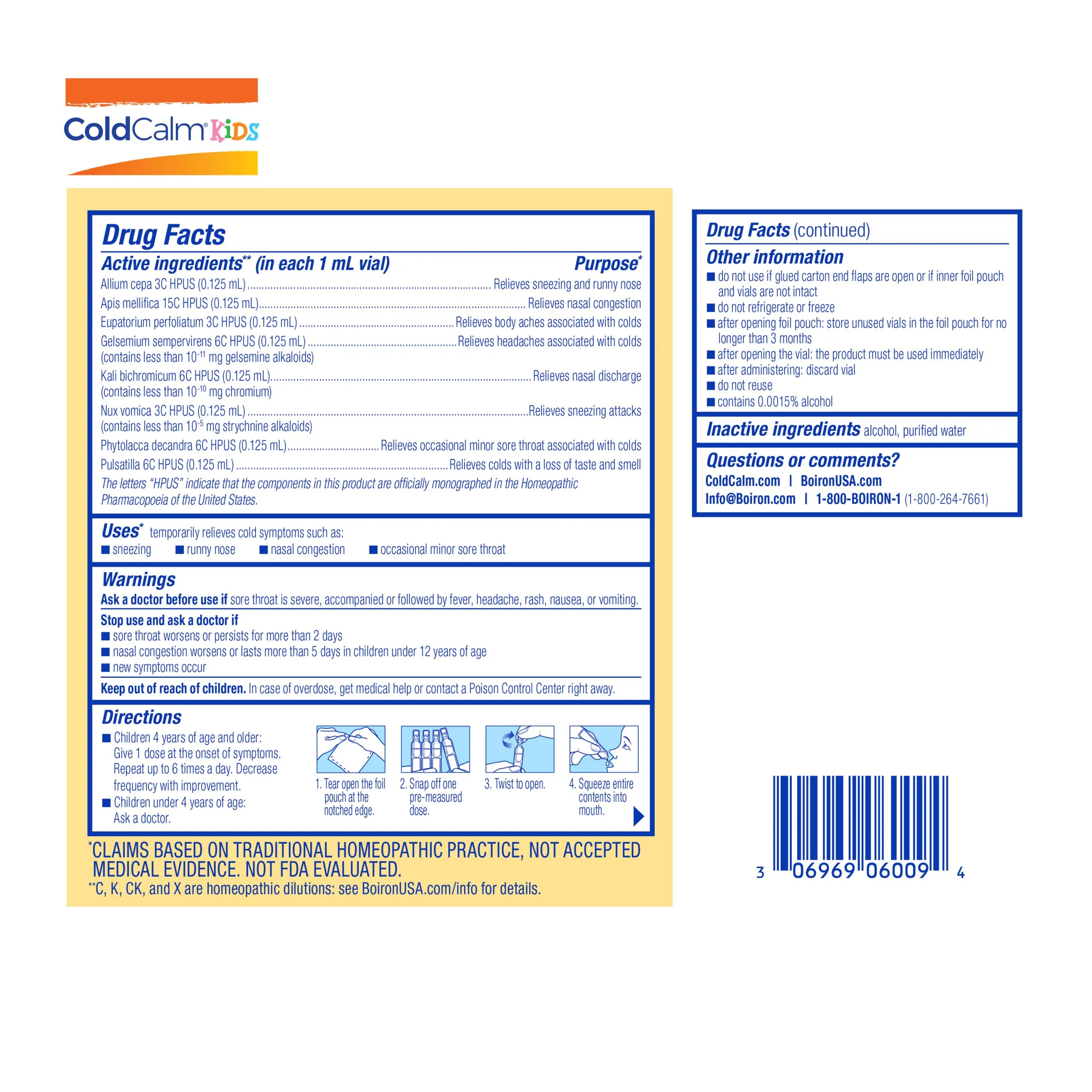 - ColdCalm Kids Liquid Doses (30 doses). Provides non-drowsy relief for common cold symptoms like sneezing, a runny nose, nasal congestion, and minor sore throat pain.* Phenylephrine-free formula in a pre-measured liquid dose for ages 4 and up.