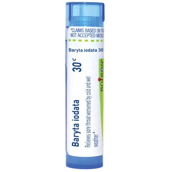 Customize your care with Boiron single medicines for highly targeted relief. Baryta Iodata 30C is a homeopathic medicine for sore throat worsened by cold and wet weather.* The pellets melt in your mouth and can be taken on the go, no food or water needed. (BoironUSA.com)