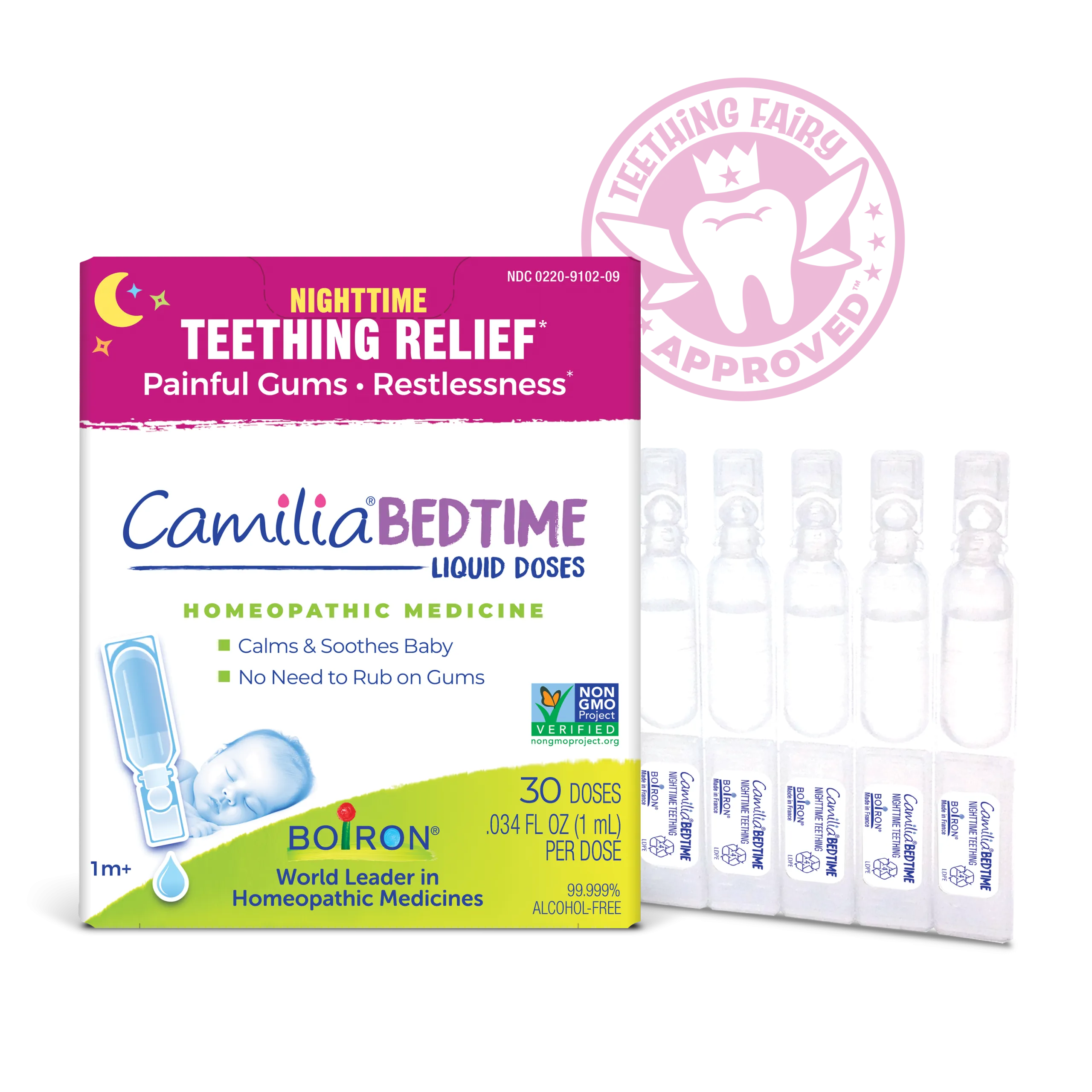 With Camilia Bedtime, soothing nighttime teething discomfort is as simple as twist and squeeze. This worry-free, plant-based homeopathic medicine helps relieve restlessness, painful gums, irritability, and minor digestive upsets associated with teething at night.* Convenient, pre-measured liquid doses make it easy to comfort your baby or toddler at bedtime without mess or fuss — no rubbing on gums required. That’s what makes them Teething Fairy Approved!™