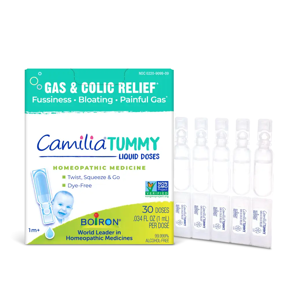 No more fumbling with measuring spoons or complicated mixtures — just twist, squeeze and go with Camilia Tummy’s pre-measured liquid doses. These homeopathic baby gas drops conveniently soothe gas and colic symptoms in one tummy-taming formula. Crafted with a blend of non-GMO pure active ingredients, Camilia Tummy provides gentle relief of tummy pain, bloating, excessive or painful gas and associated fussiness and crying.*