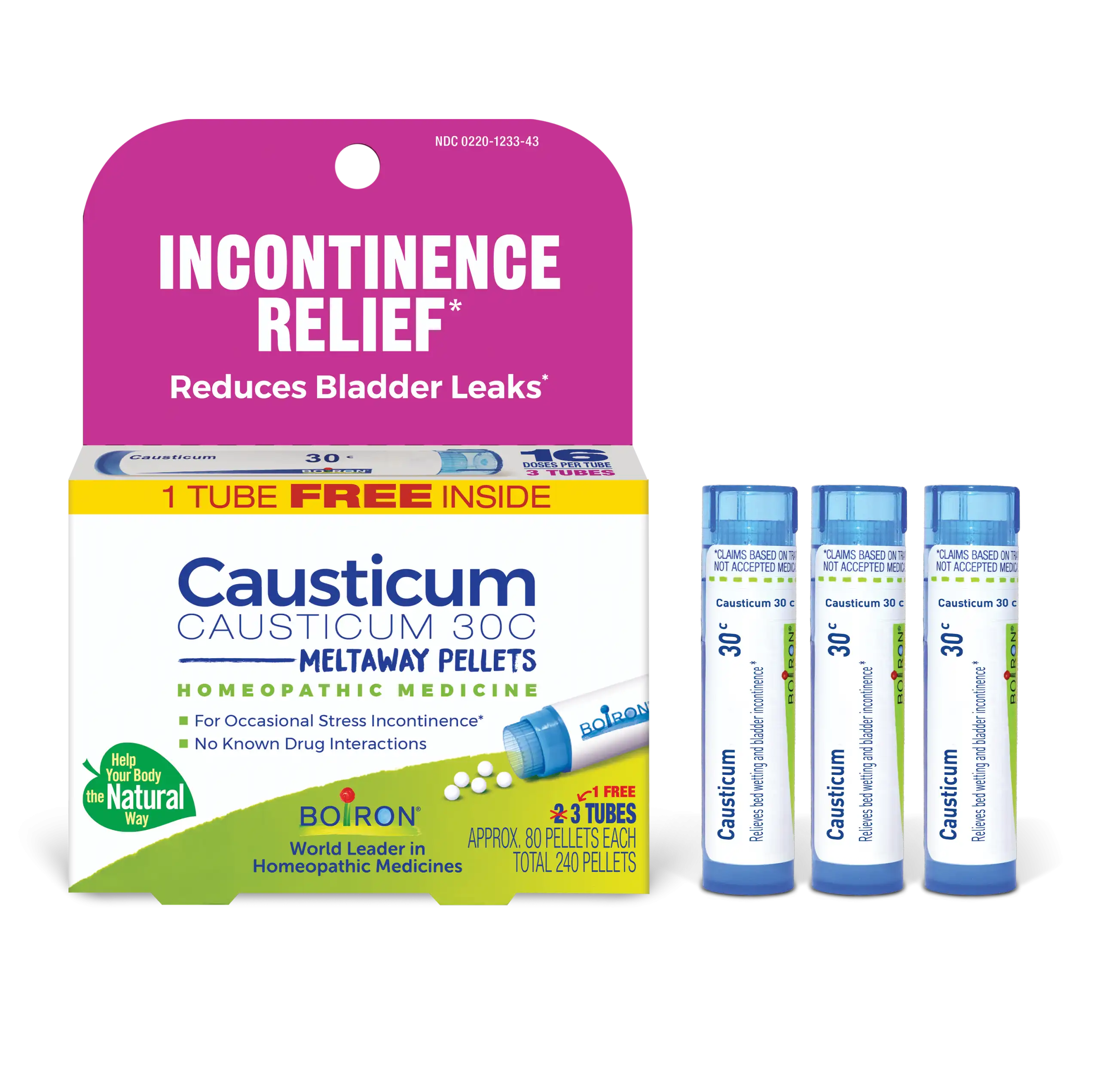 Customize your care with Boiron single medicines for highly targeted relief. Causticum is a homeopathic medicine that reduces occasional bladder leaks from coughing, laughing, sneezing, or exercise.* It will not interact with other medications, herbs, or supplements. The meltaway pellets dissolve in the mouth without water and come in easy dispensing tubes to take on the go.