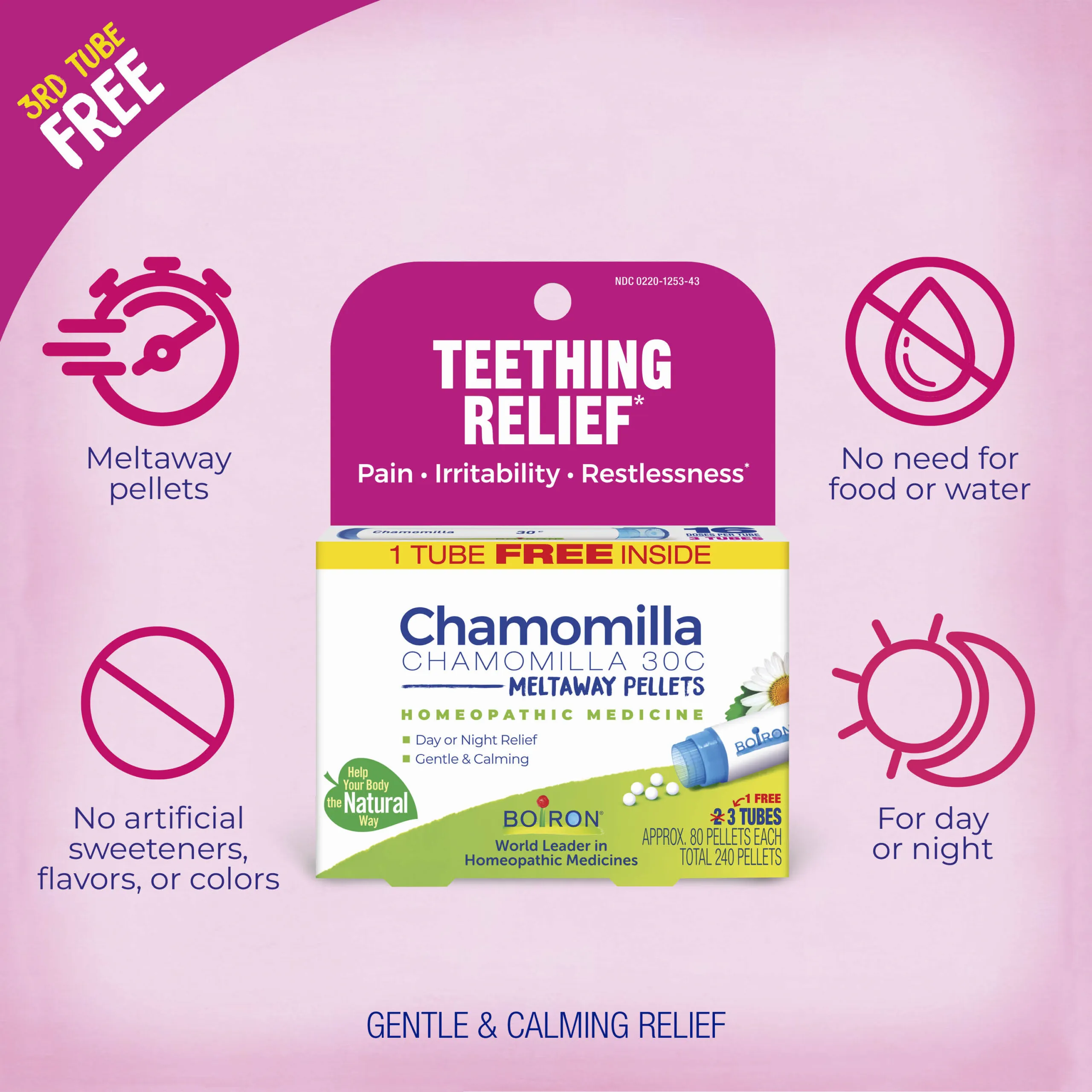 - Includes three easy dispensing tubes of Chamomilla 30C pellets for the price of two (48 doses total).