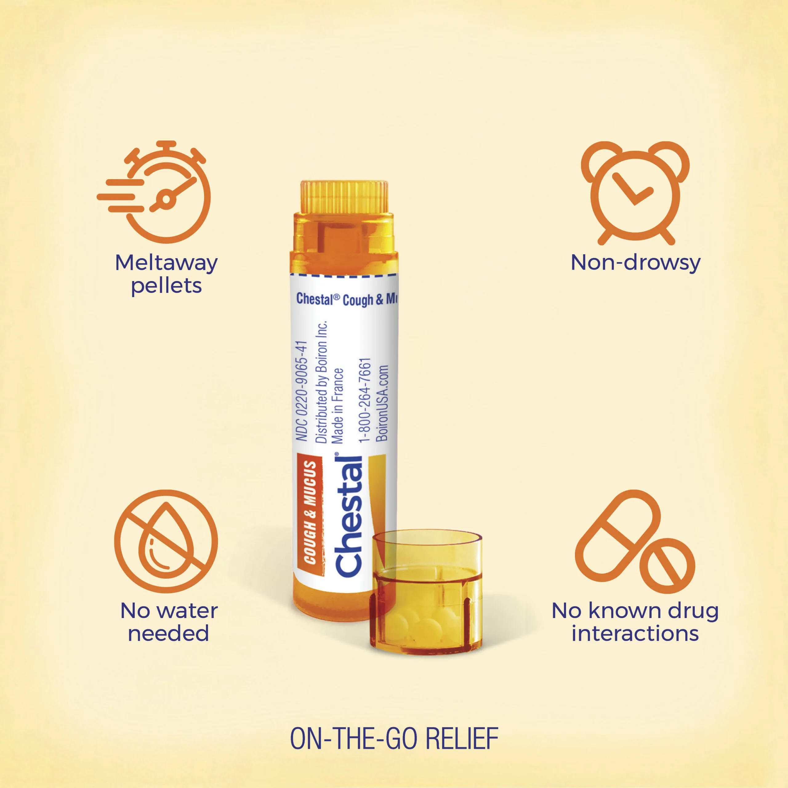 Get cough relief you can carry anywhere with Chestal Cough & Mucus Meltaway Pellets. This medicine melts in your mouth to relieve dry coughs and minor throat irritations that can occur with a cold, and it loosens mucus to make coughs more productive.* Each pack comes with two tubes to keep at home or take on the go.