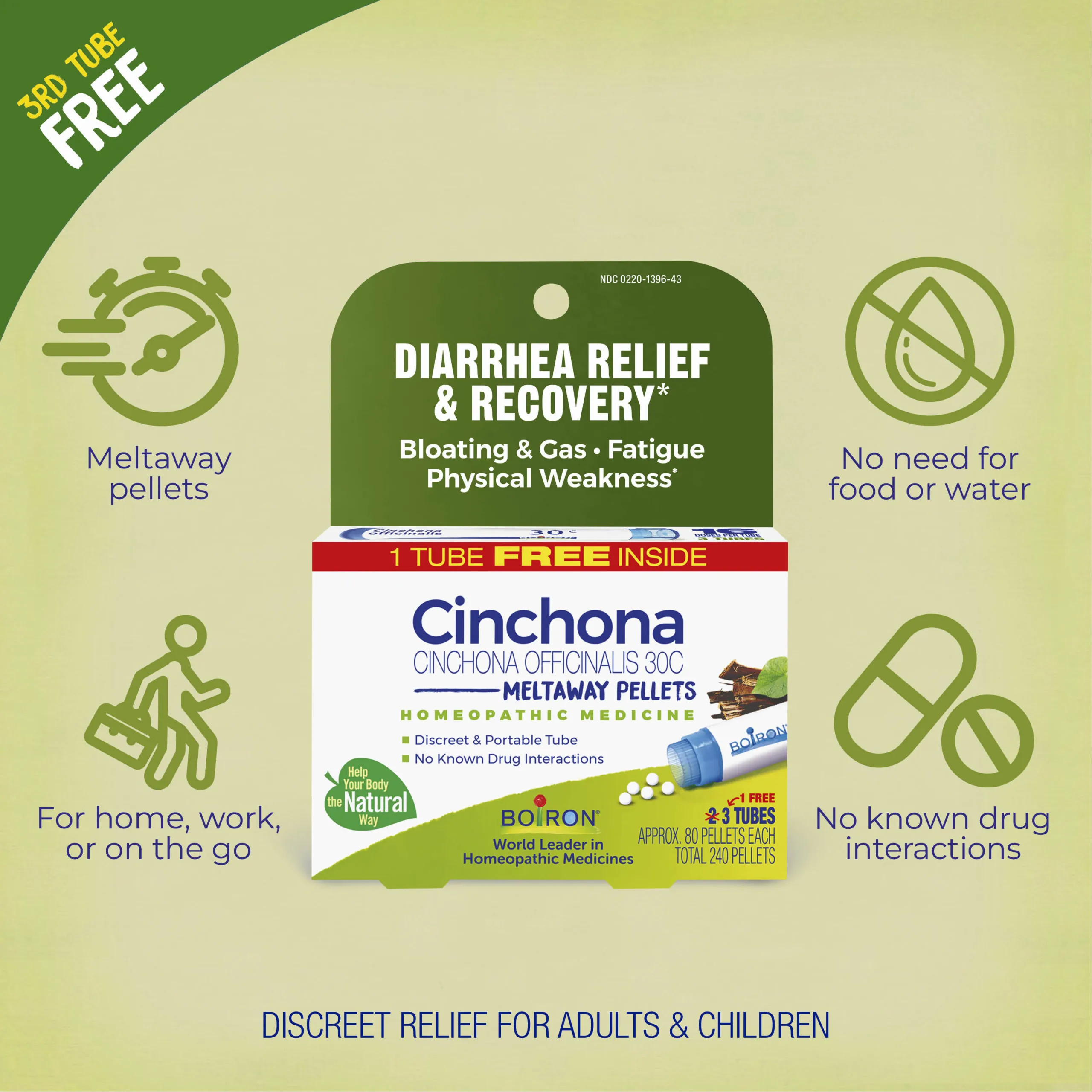Boiron Cinchona officinalis 30C meltaway pellets provide targeted relief and recovery from diarrhea with bloating and gas, fatigue, and physical weakness.* Made with a single, plant-based active ingredient, this homeopathic medicine will not cause stool discoloration or constipation and has no known interactions with other medications or supplements. The unflavored pellets melt in the mouth for convenient and discreet relief anytime.