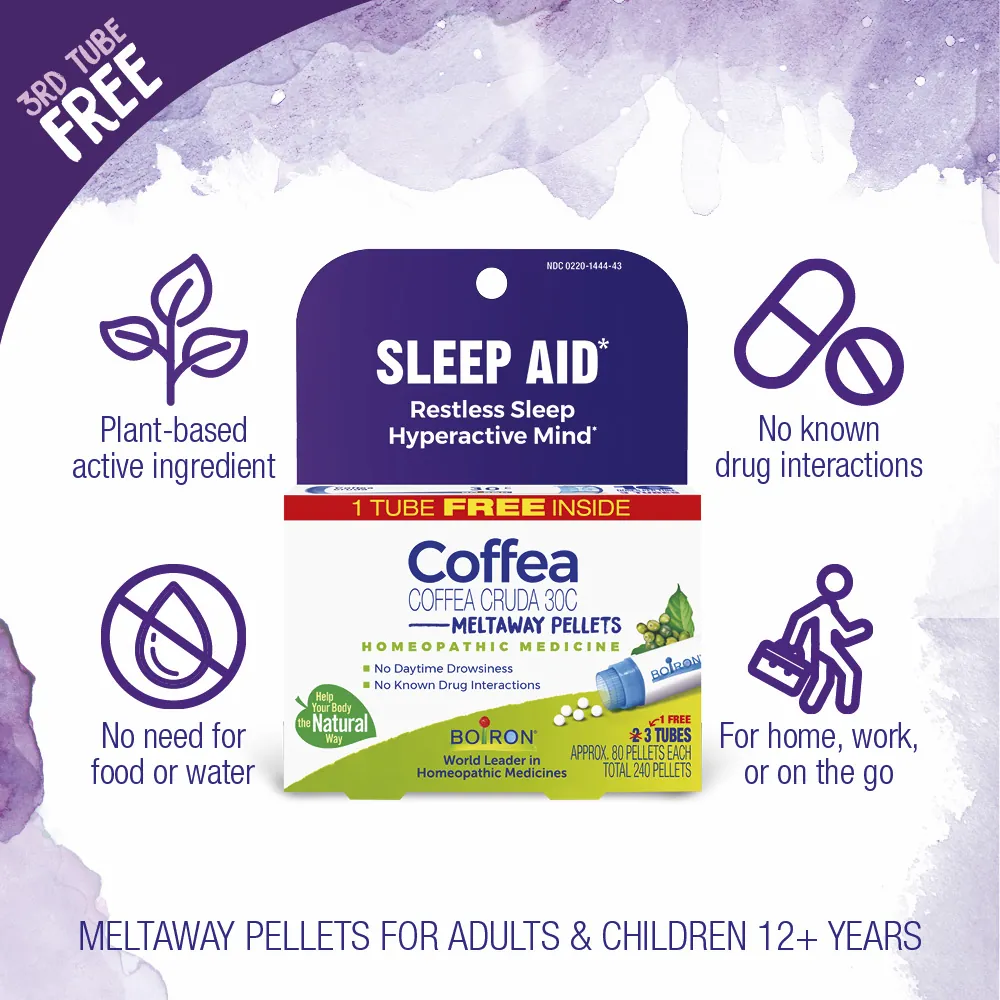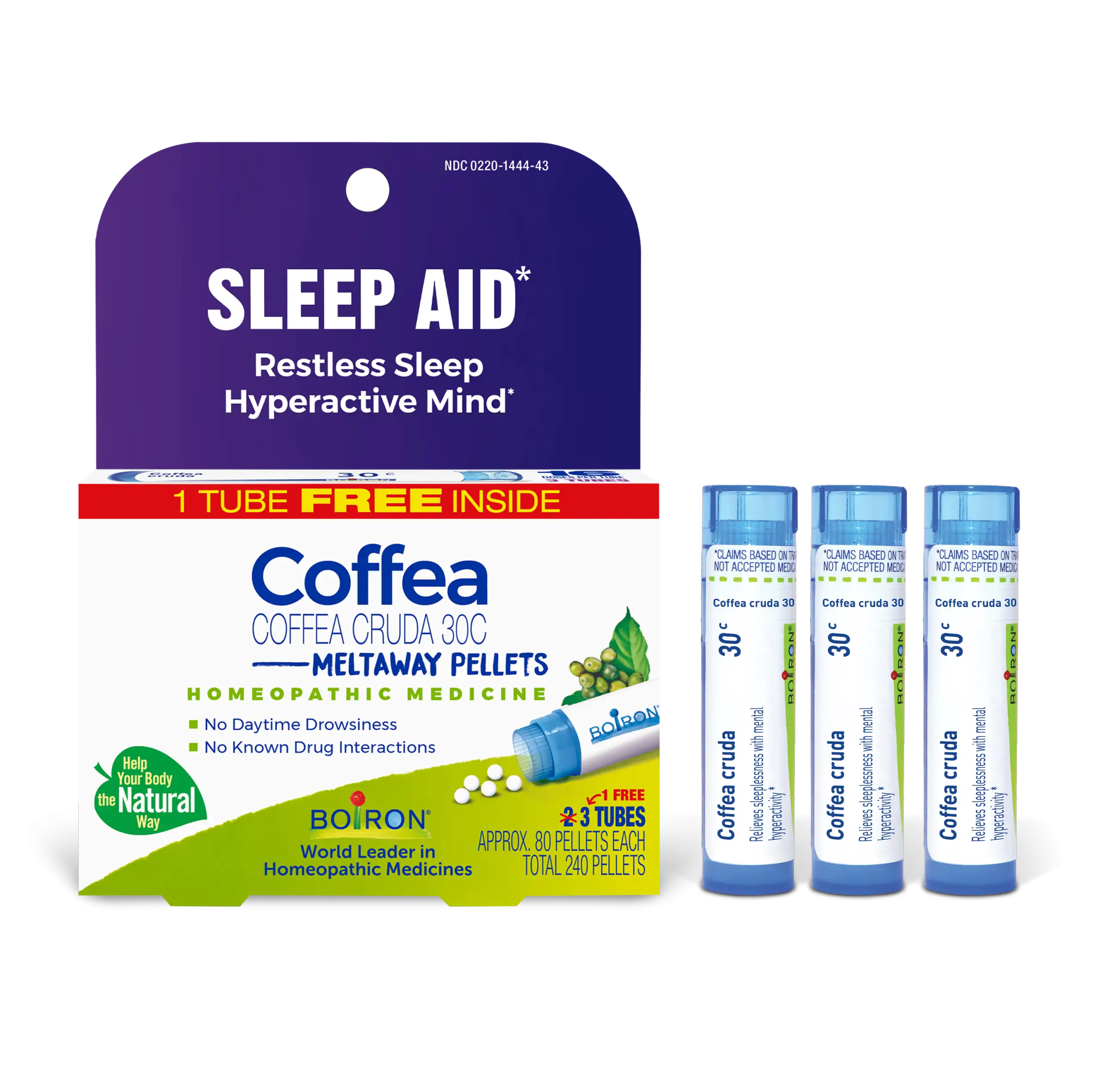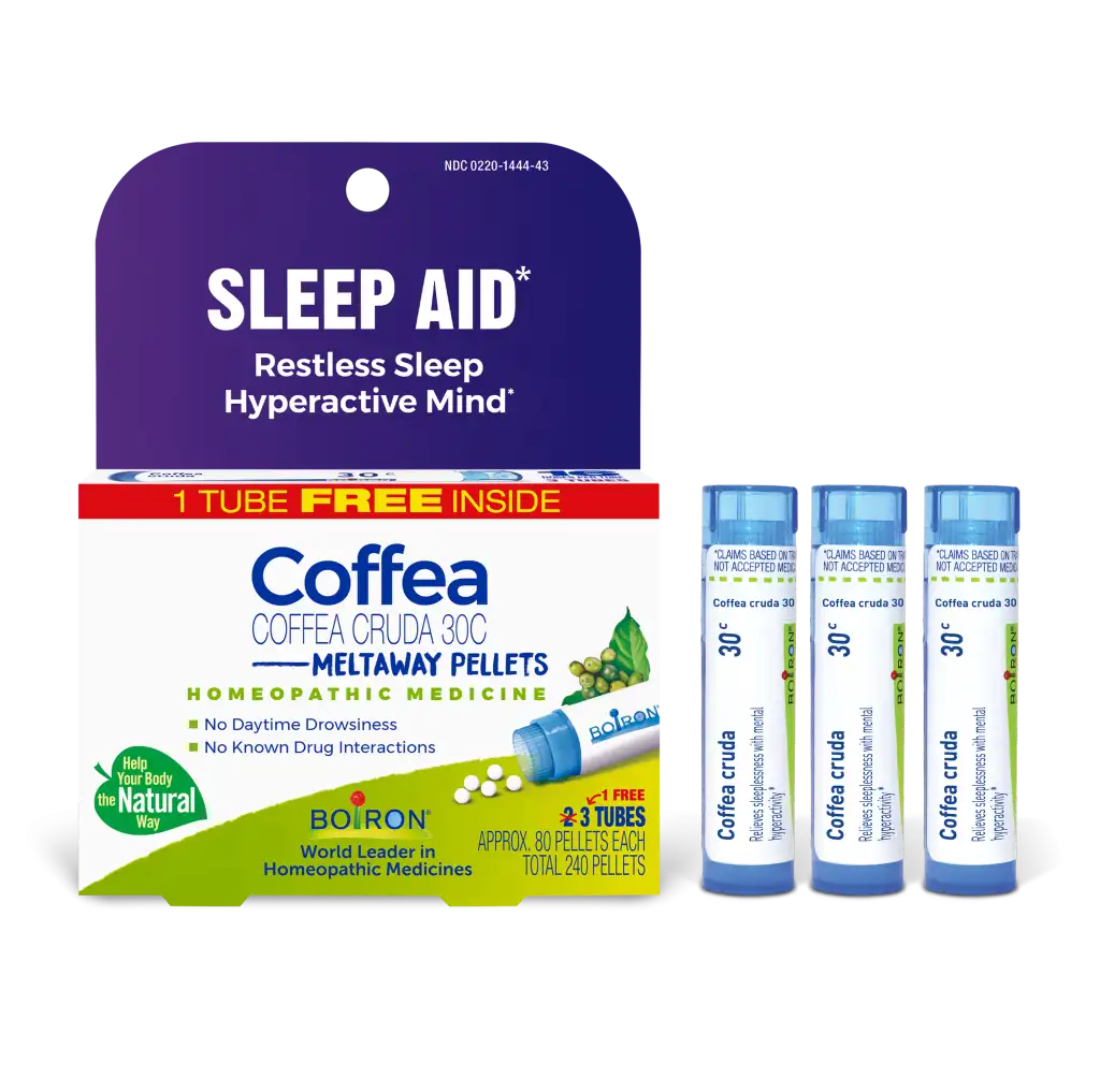 Customize your sleep care with a Boiron single medicine like Coffea cruda 30C. This homeopathic sleep aid relieves occasional sleeplessness and restless sleep due to mental hyperactivity, racing thoughts, worries, and concerns.* Itโs made with a single, plant-based active ingredient that wonโt cause daytime drowsiness or interact with other medications and supplements. Easy to take at bedtime or while traveling, the unflavored meltaway pellets dissolve in your mouth without the need for food or water.