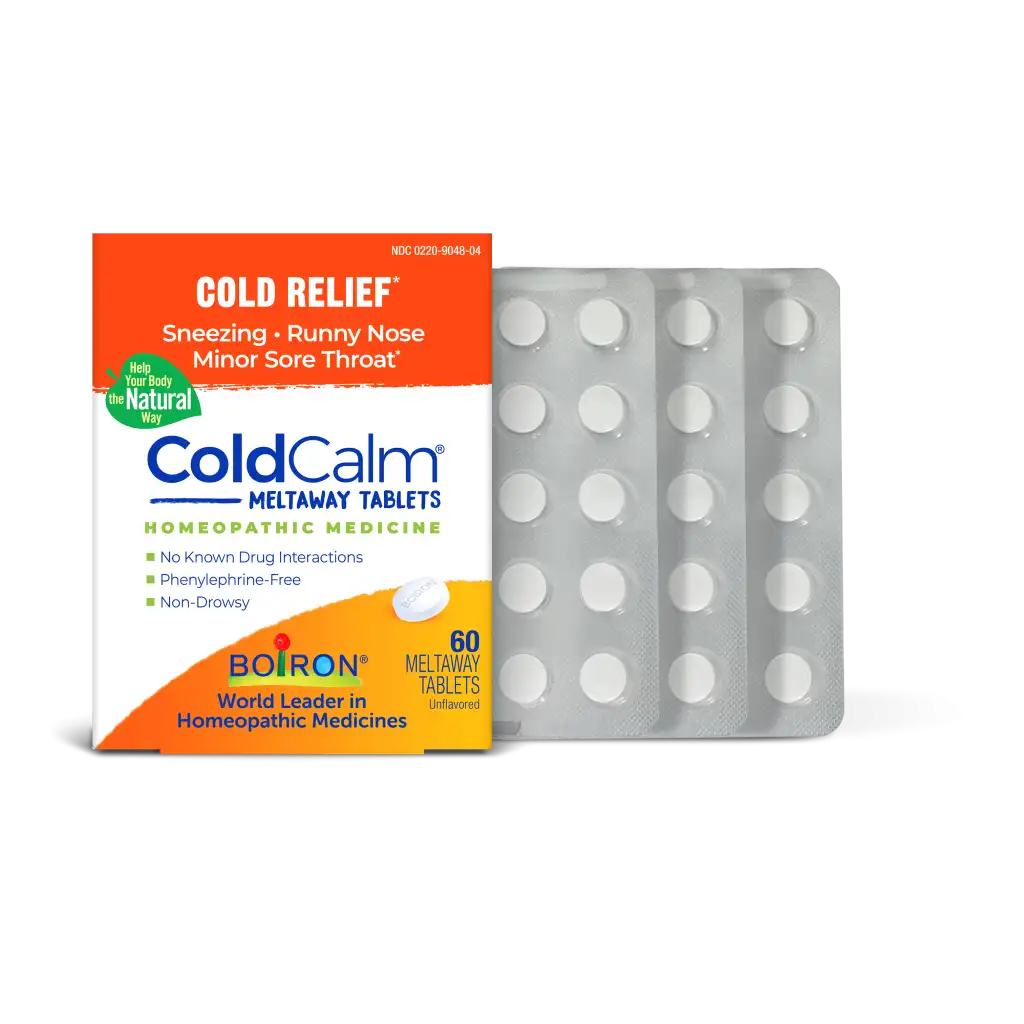 Discover a better way to calm cold symptoms with ColdCalm Tablets by Boiron. Unlike conventional medications that merely mask symptoms, this homeopathic cold medicine targets specific symptoms at the onset, established and resolution stages of the common cold. The non-drowsy, meltaway tablets are easy to take at the first sign to relieve sneezing, runny nose, nasal congestion, and minor sore throat pain.*