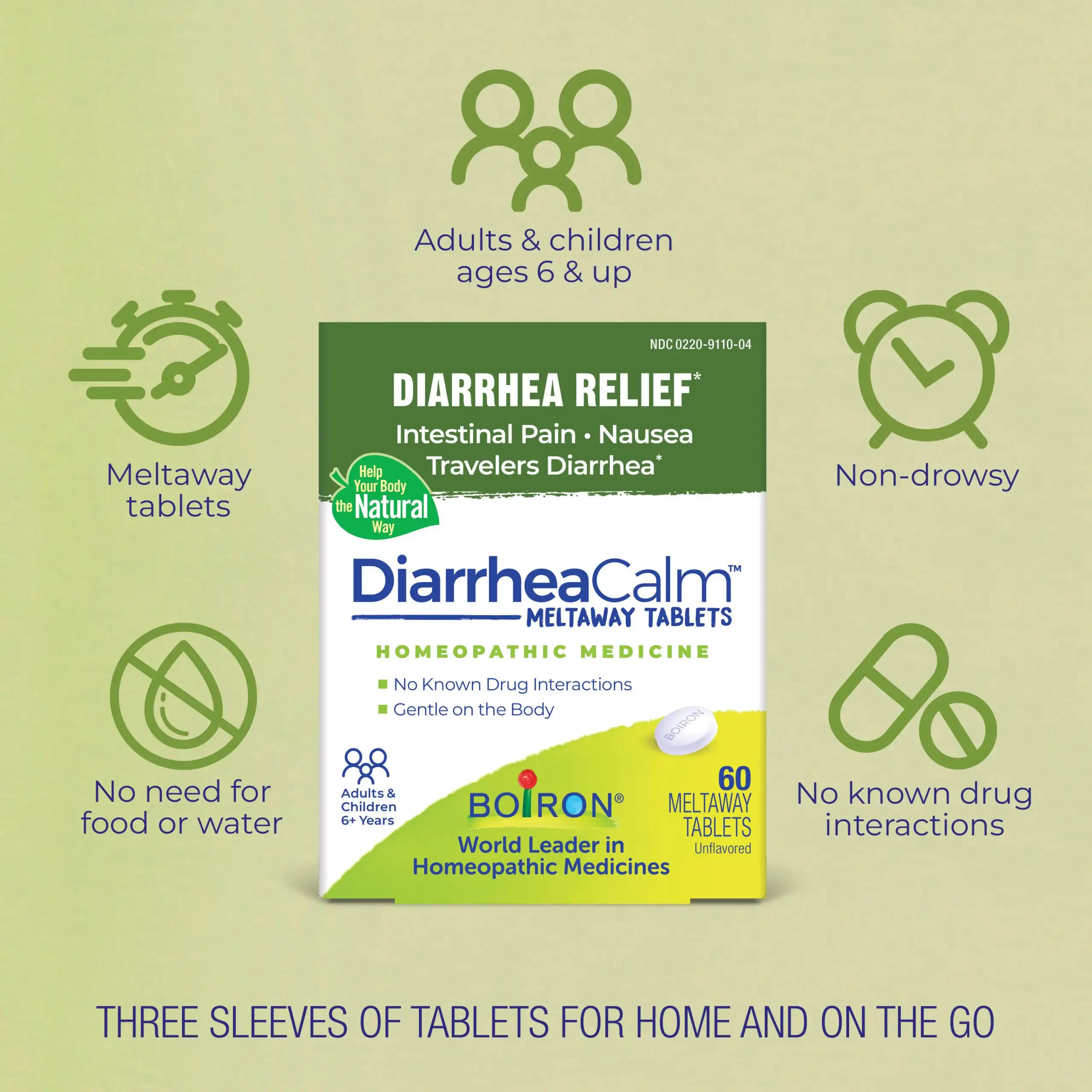 - Also try DiarrheaCalm On the Go Meltaway Pellets for travel-friendly relief.