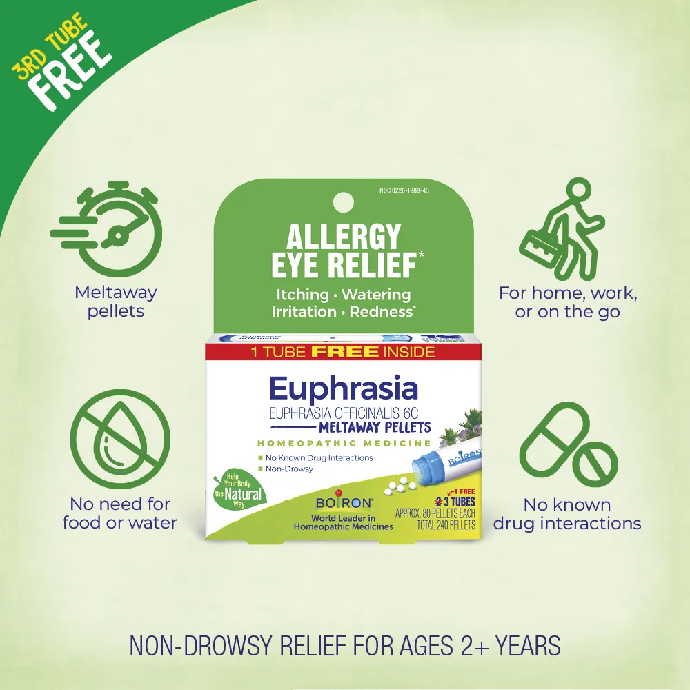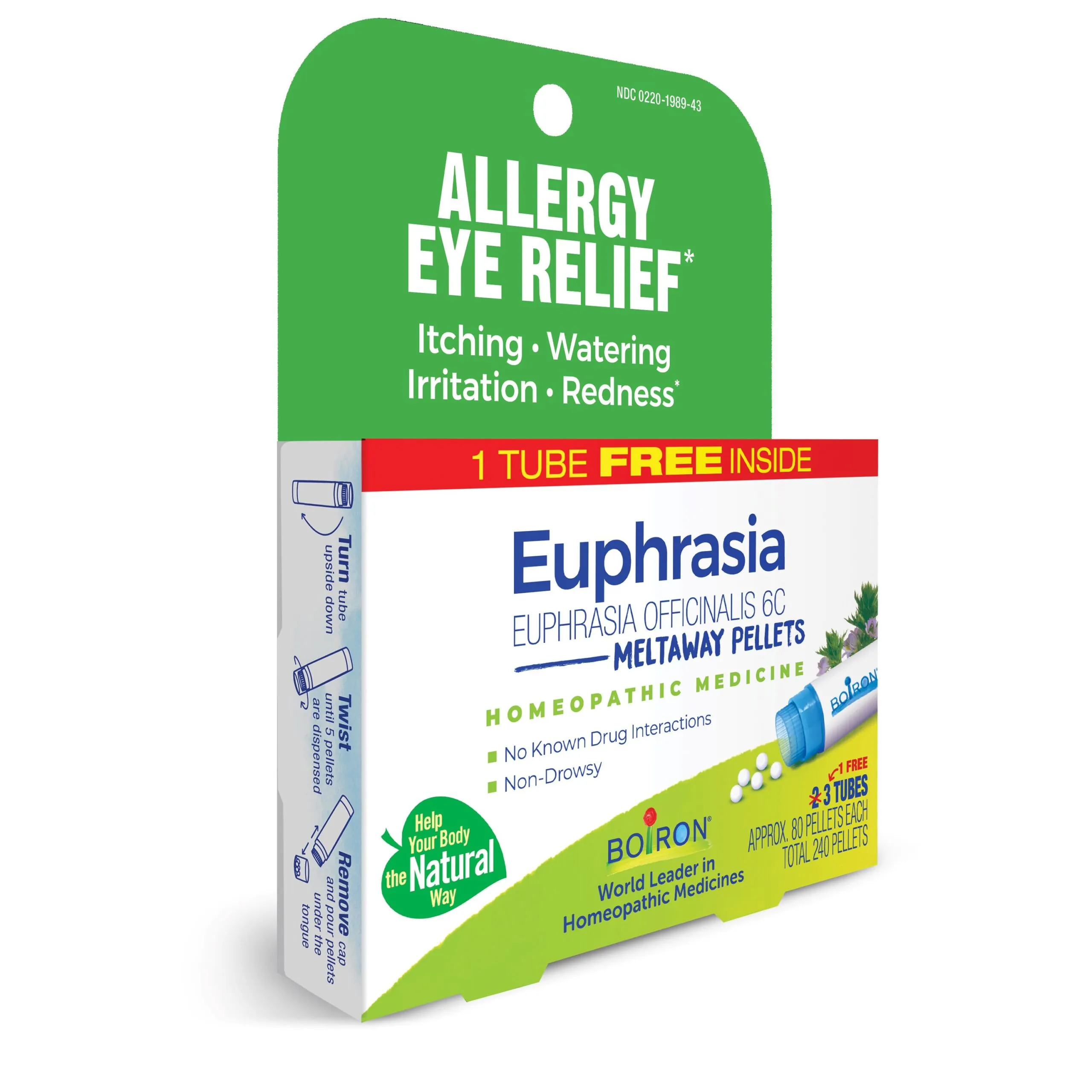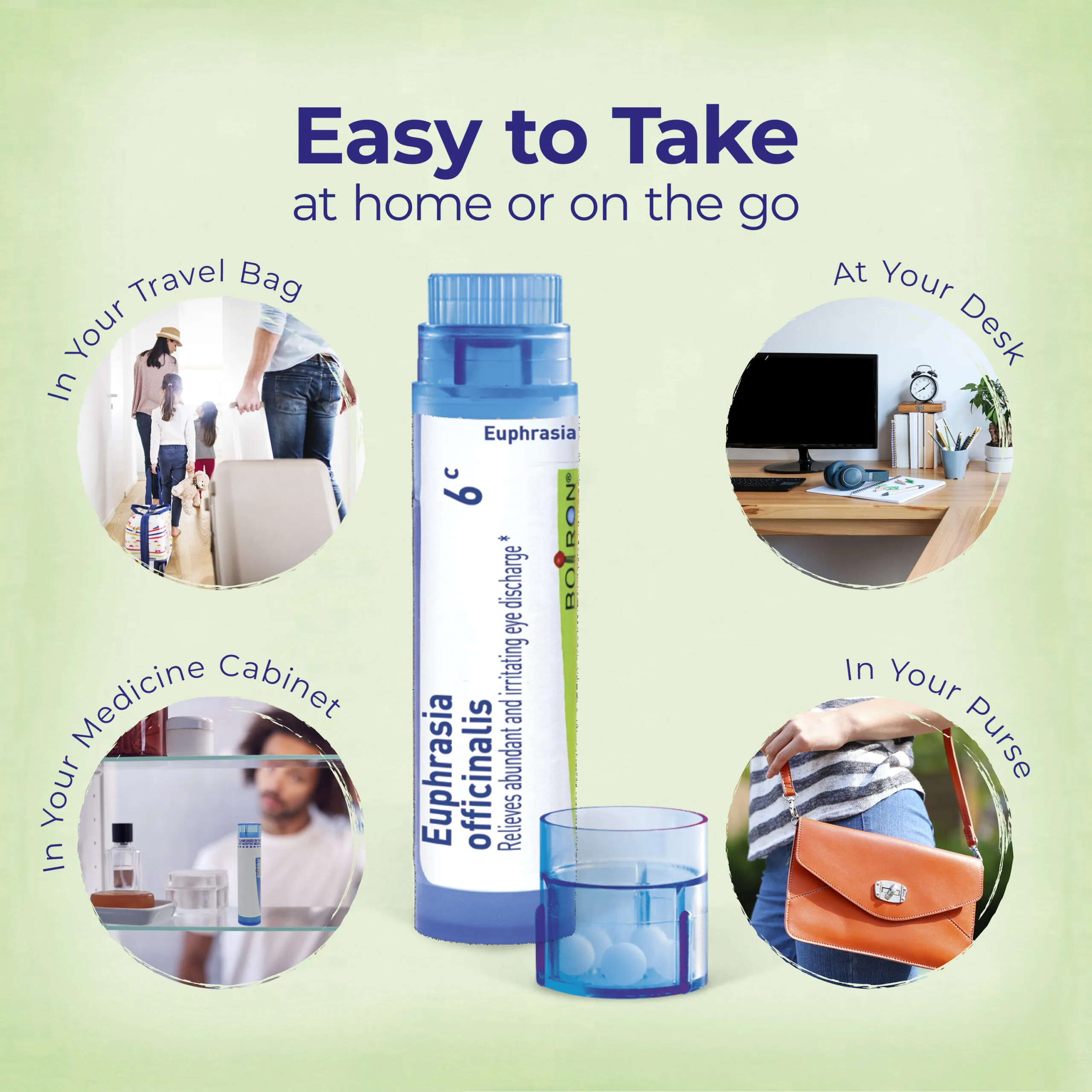 Customize your care with Boiron single medicines for highly targeted relief. Euphrasia officinalis 6C is a homeopathic medicine that targets the itching, irritation, burning, watering, and redness caused by minor eye allergies.* The non-drowsy meltaway pellets dissolve under the tongue without water and come in easy dispensing tubes to take on the go.