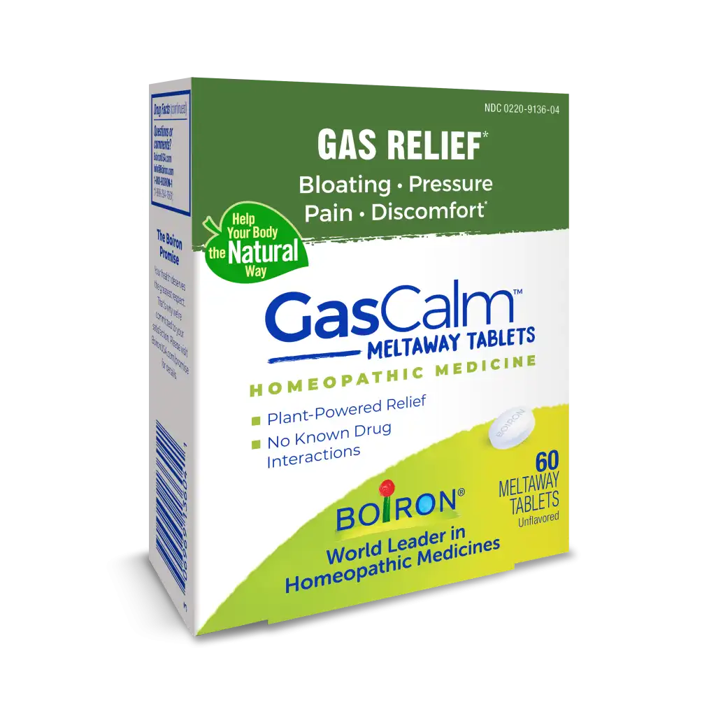 GasCalm Meltaway Tablets by Boiron provide targeted treatment for embarrassing gas and bloating over typical digestive relief products that take a one-size-fits-all approach to symptoms. This homeopathic medicine is made with plant-based active ingredients that relieve bloating, pressure, discomfort, and pain associated with gas.* The unflavored tablets melt in the mouth without water, making them easy to take when bloated.