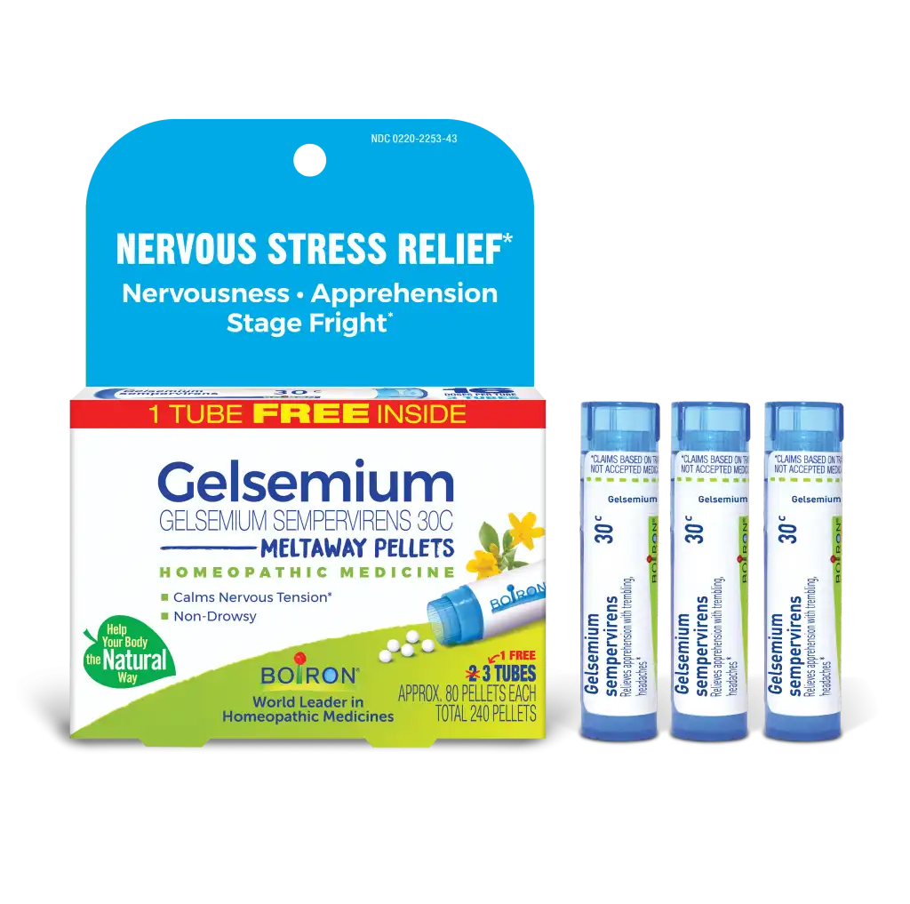 Customize your care with a Boiron single medicine like Gelsemium sempervirens 30C. This homeopathic stress reliever calms occasional nervous tension, apprehension, and stage fright without the use of chemical sedatives.* It also uniquely addresses accompanying symptoms such as trembling, uneasiness, inhibition, and headaches.* Gelsemium is made with a single, plant-based active ingredient that wonโt affect alertness or interact with other medications or supplements. Easy to take, the unflavored meltaway pellets dissolve in your mouth without the need for food or water.