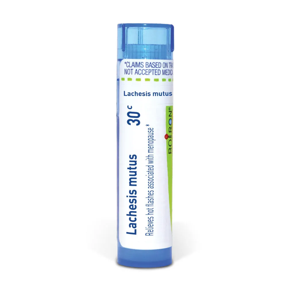 Customize your care with Boiron single medicines for highly targeted relief. Lachesis Mutus is a homeopathic medicine that relieves hot flashes associated with menopause.* The pellets melt in your mouth and can be taken on the go, no food or water needed.