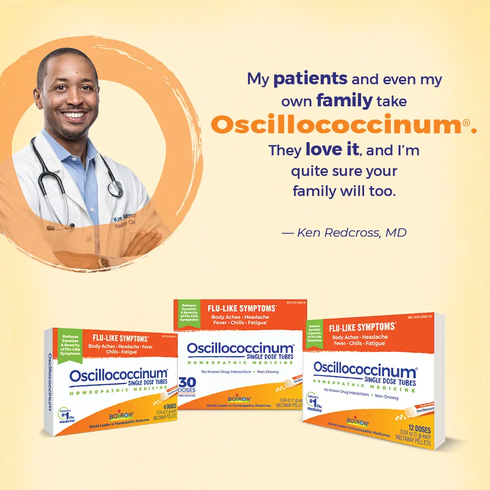 The moment you feel achy or run down, take Boiron Oscillococcinum and feel like yourself again. Trusted as Nature’s #1 flu medicine, Oscillococcinum has been shown in clinical studies to reduce the duration and severity of flu-like symptoms such as body aches, headache, fever, chills, and fatigue.* Easy to take, the meltaway pellets dissolve in the mouth and are recommended for everyone ages 2 and up.