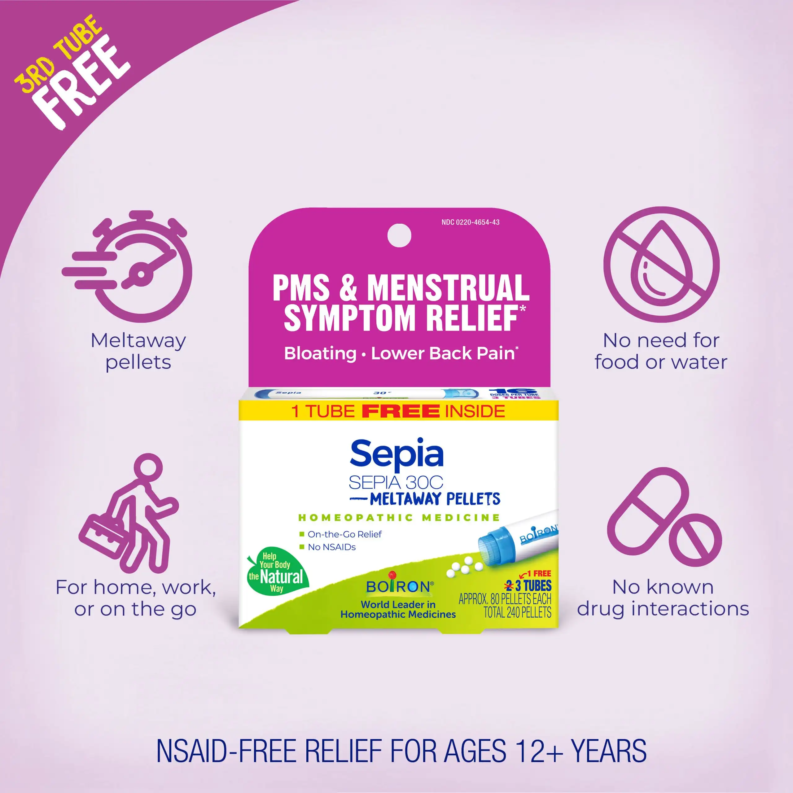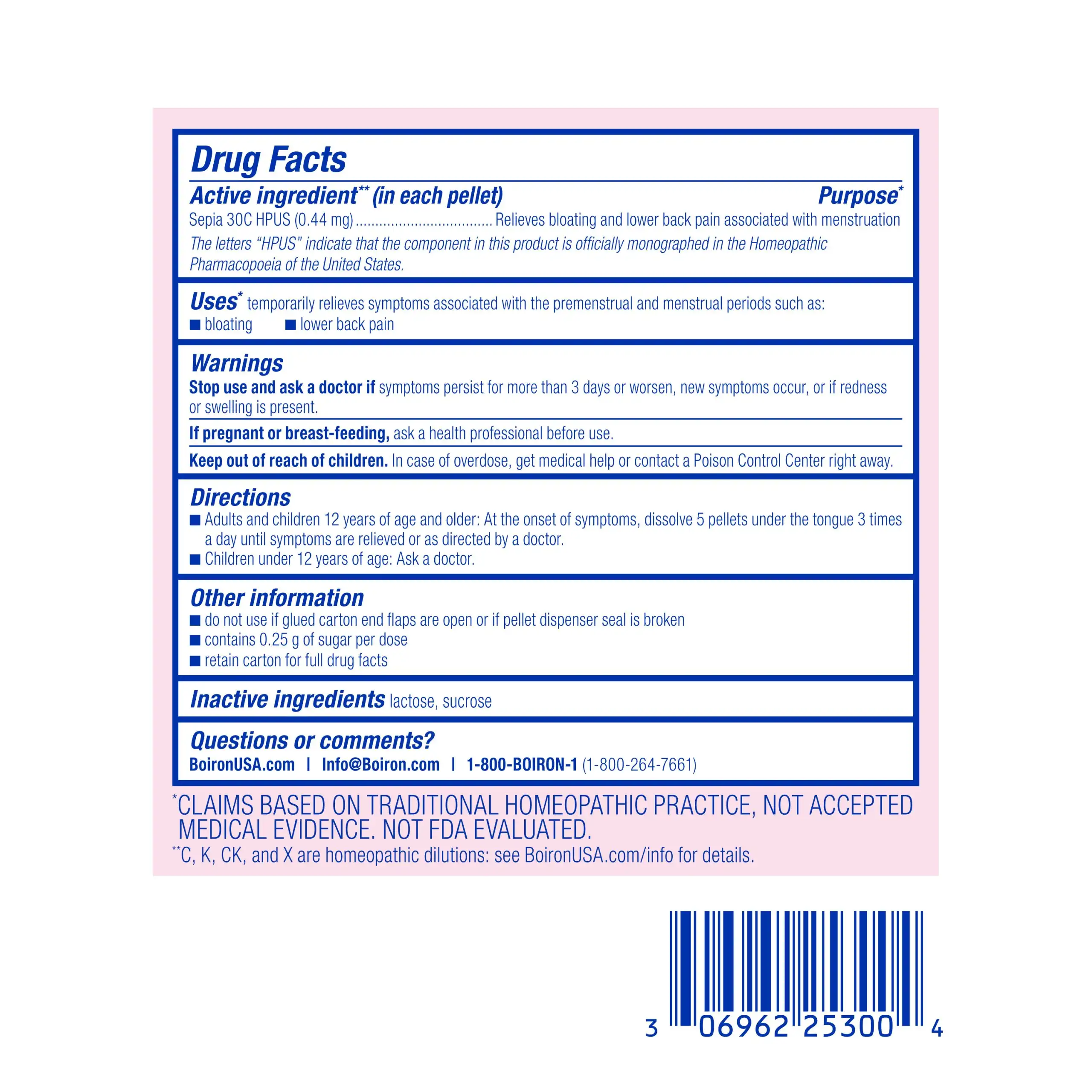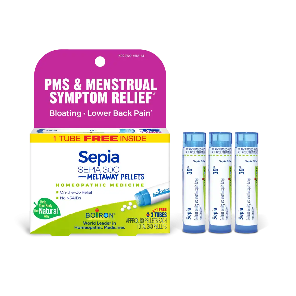 Customize your care with Boiron single medicines for highly targeted relief. Sepia 30C is a homeopathic medicine that targets symptoms associated with the premenstrual and menstrual periods such as bloating and lower back pain.* The non-drowsy meltaway pellets dissolve under the tongue without water and come in easy dispensing tubes to take on the go.