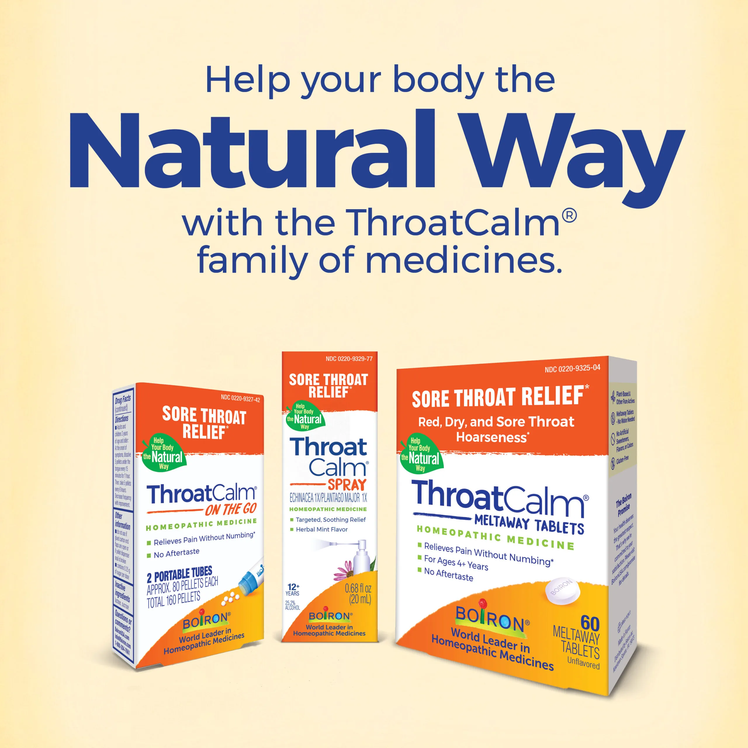 - Also try ThroatCalm in meltaway tablets and on-the-go pellets for added convenience.