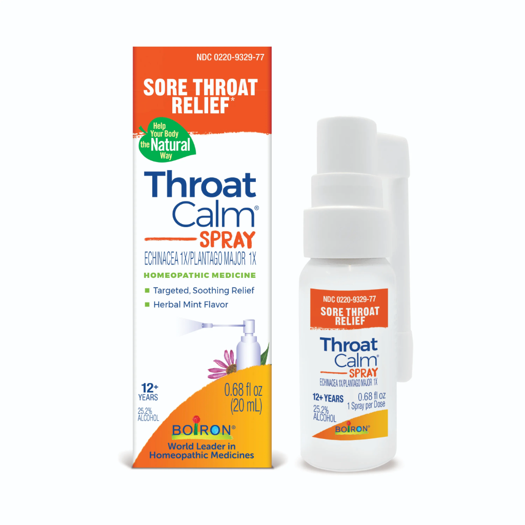 ThroatCalm Spray by Boiron is a cooling mist that works on contact to provide targeted sore throat relief without the numbing effects of traditional throat sprays and lozenges. Every spray delivers a dose of plant-powered active ingredients, including Echinacea, to soothe and relieve occasional minor sore throat pain.* The natural, mint-like herbal flavor tastes light and refreshing, making it a go-to solution for easy and enjoyable relief.