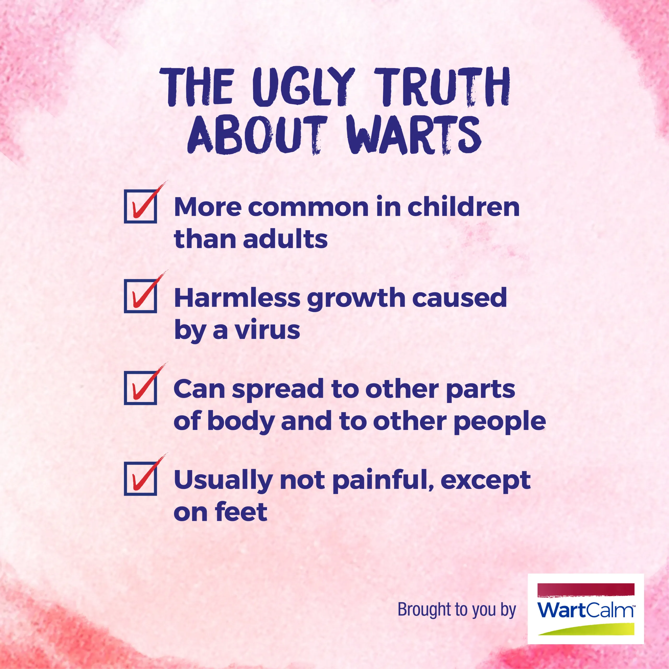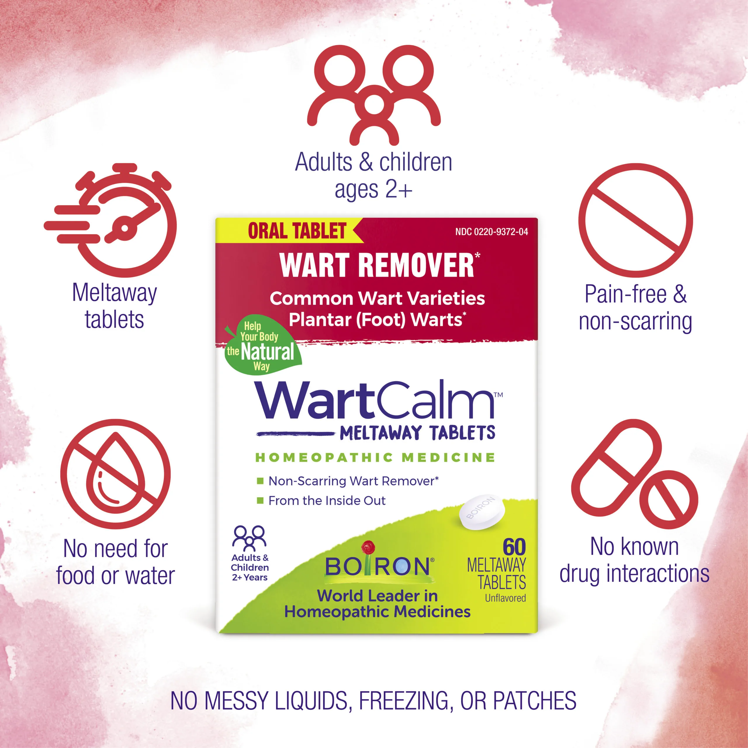 For a better way to remove warts, start from the inside out. WartCalm is a convenient oral option for pain-free wart removal. There’s no need to contend with messy liquids, freezing, or patches that can sting, irritate, or damage skin. WartCalm uses plant-based and other pure active ingredients that work from within to remove common warts on the body and plantar warts on the feet.* Simply melt the unflavored tablets in your mouth each morning and evening until warts disappear.