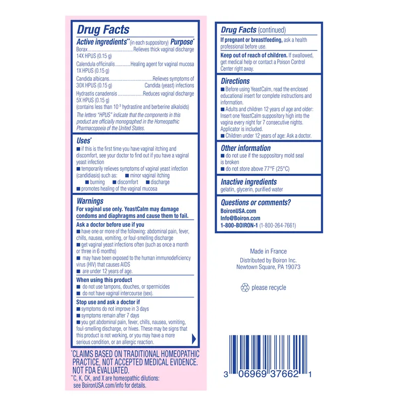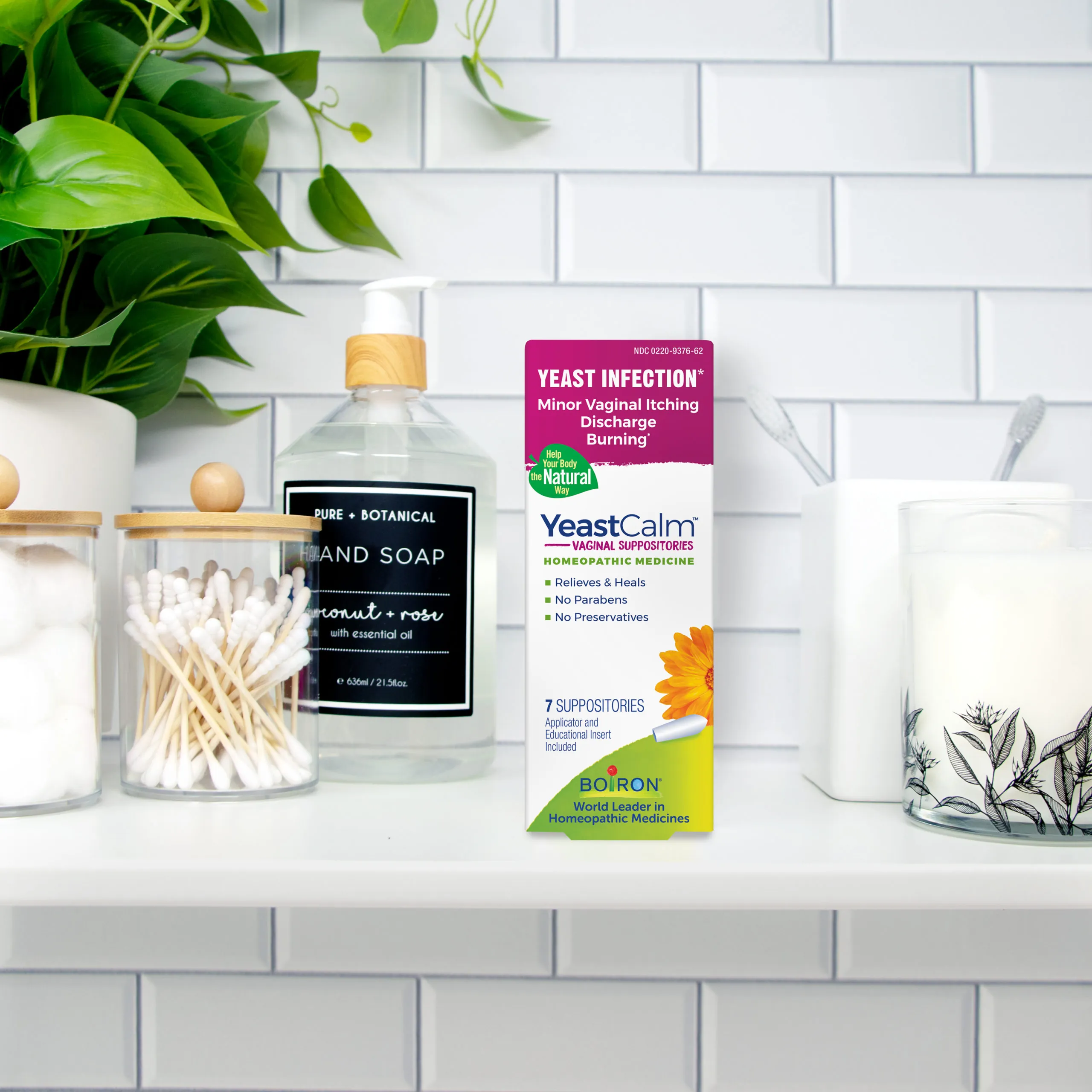 If you suffer from yeast infections, it’s time to get relief. YeastCalm by Boiron calms the discomfort of minor vaginal itching and burning from yeast infections with plant-based and other pure active ingredients.* Plus, it’s powered by Borax and Calendula to heal delicate vaginal tissue.* YeastCalm is a comfortable and practical solution that’s free of parabens and preservatives. These once-daily overnight suppositories conveniently deliver treatment directly to the affected area for continued improvement throughout the night.