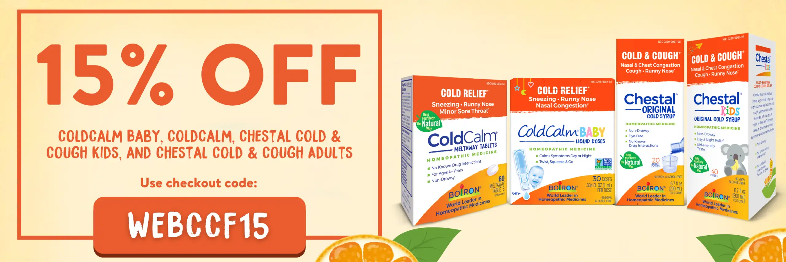 Save 15% on ColdCalm Baby, ColdCalm, Chestal Cold & Cough Kids, and Chestal Cold & Cough Adults with code WEBCCF15.